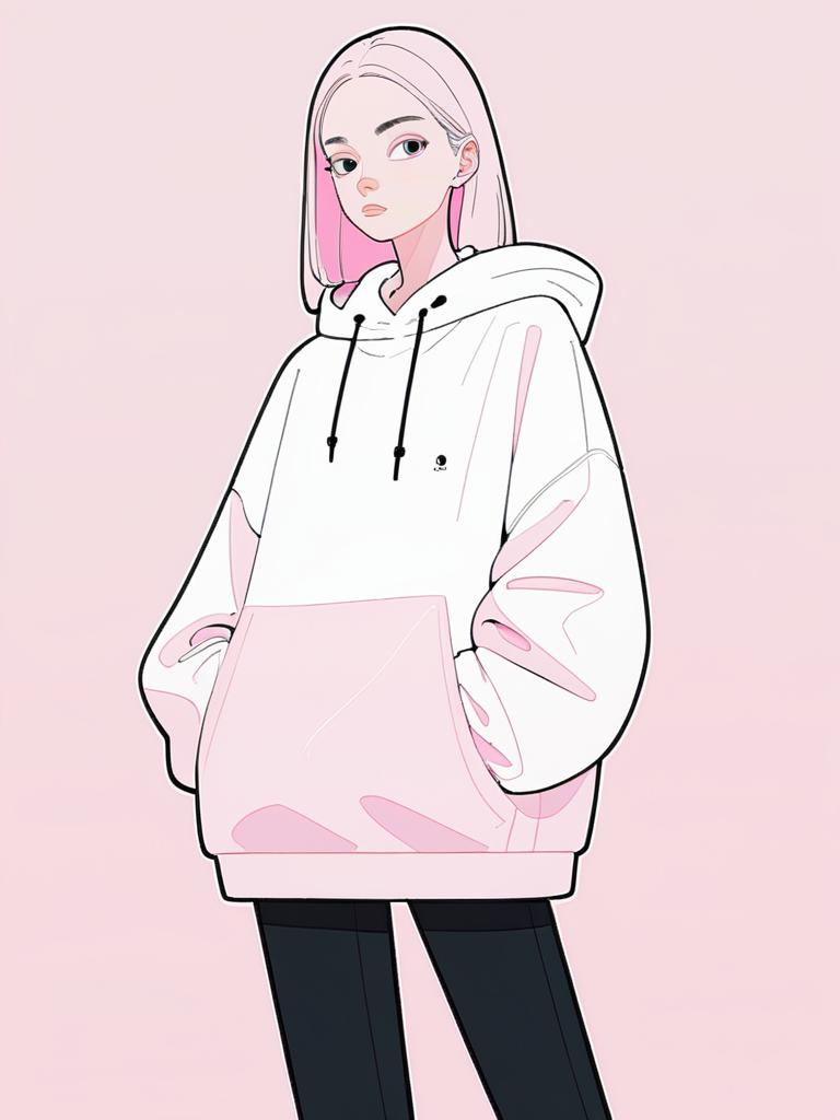 Illustration of a stylish young woman standing confidently wearing a white oversized hoodie and black leggings. The image features a clean minimalistic modern cartoon style with sharp outlines and a soft pastel pink and white color scheme, set against a light pink background.