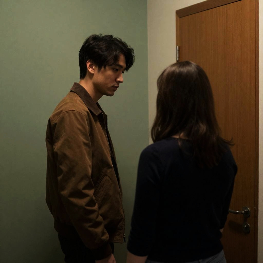 Photograph of two people in a narrow hallway. Man with dark hair, side profile, brown jacket, and black shirt. Woman with shoulder-length brown hair, back to camera, dark top. Wooden door with metal handle on the right. Green ured wall on the left. Dim lighting.