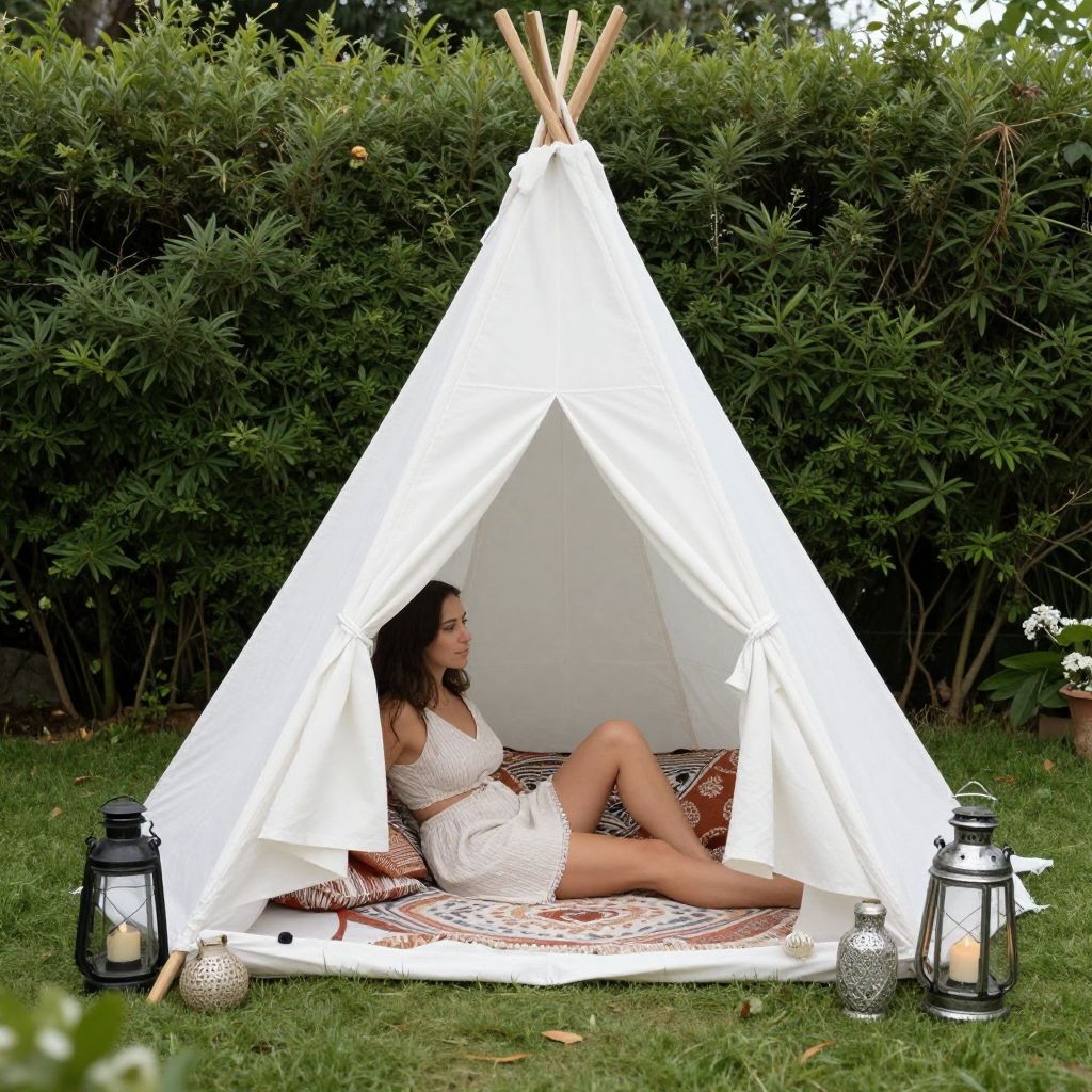 Woman relaxing inside a cozy white teepee tent set up outdoors in a lush green garden, surrounded by a backdrop of dense shrubs and featuring a bohemian-style setup with pillows, blankets, and decorative lanterns.