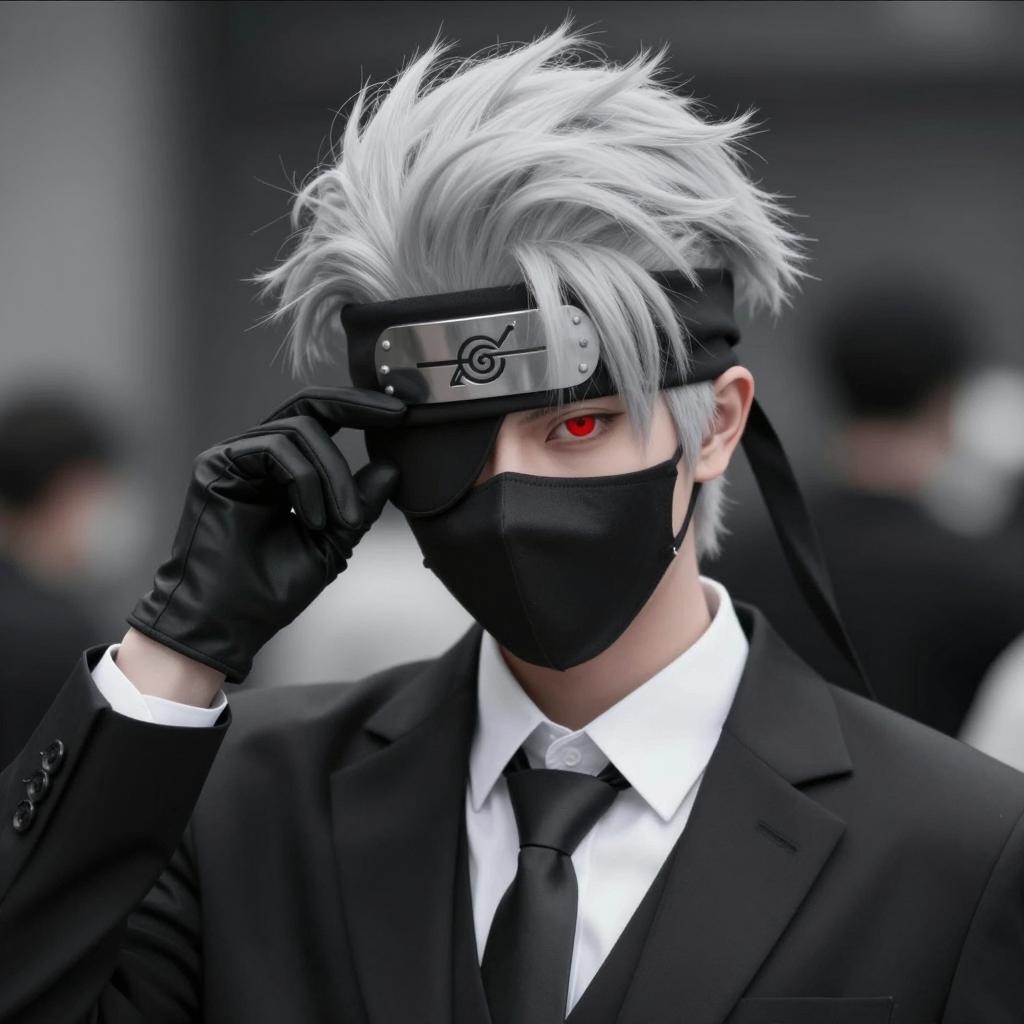 Young male with yellow spiky hair, black headband, and face paint, lying on pine needles, wearing black and orange ninja attire, reaching forward with a black knife. Multiple red scars on face and arm. Background: blurred wooden fence. Intense gaze.