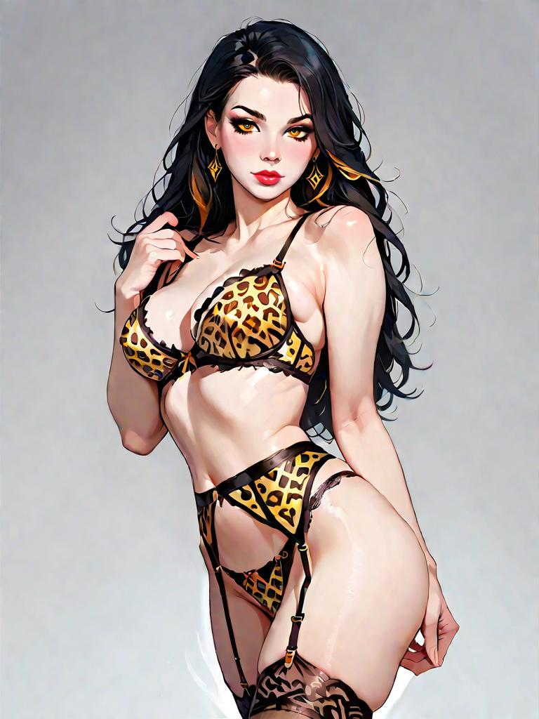 1girl, realistic face, Lingerie animal print set, leopard print lace bra, sheer mesh panties, satin garter belt, adjustable straps, black lace trim, gold accents, soft and stretchy fabric, seductive and elegant.