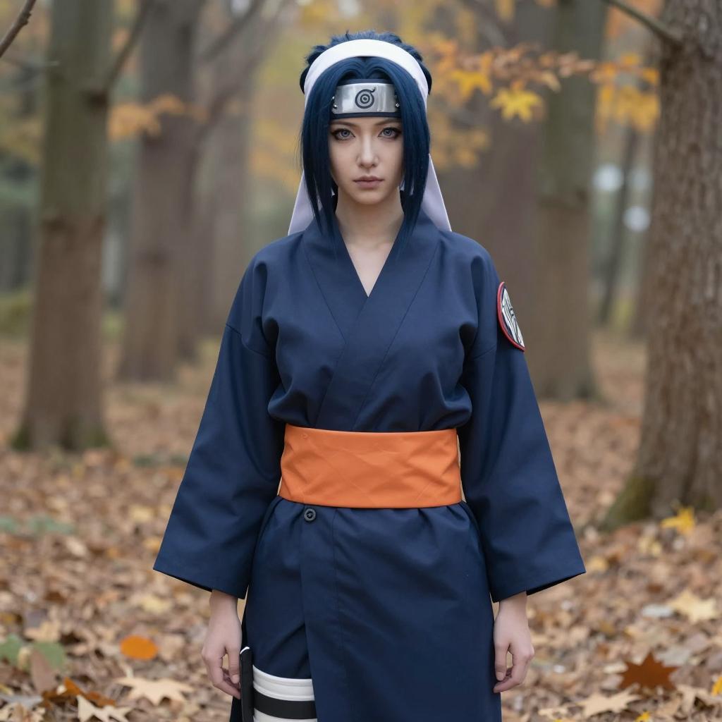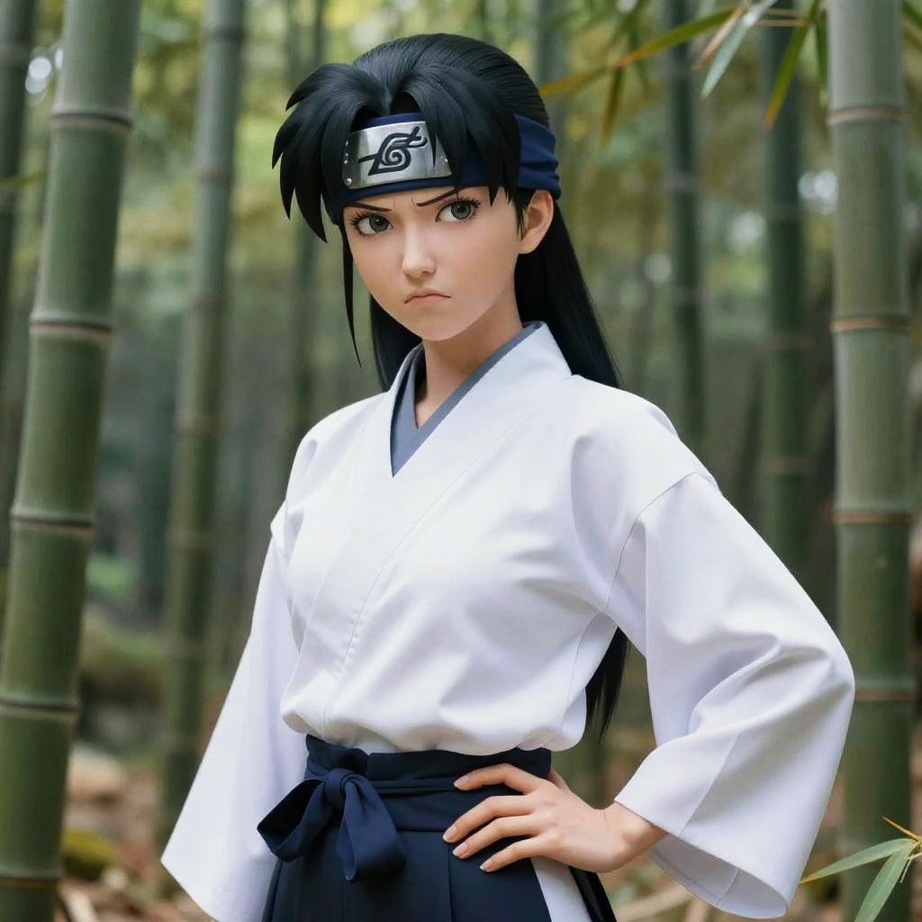 Masterpiece, absurdres, (intricate details), (colorful), cinematic lighting, bust shot, extremely detailed CG unity 8k wallpaper, tenten\(shippuden\), 1girl, solo, hakama pants, white shirt, medium breasts, hand on hip, forehead protector, konohagakure symbol, headband, looking at viewer, outdoors, bamboo forest, frown