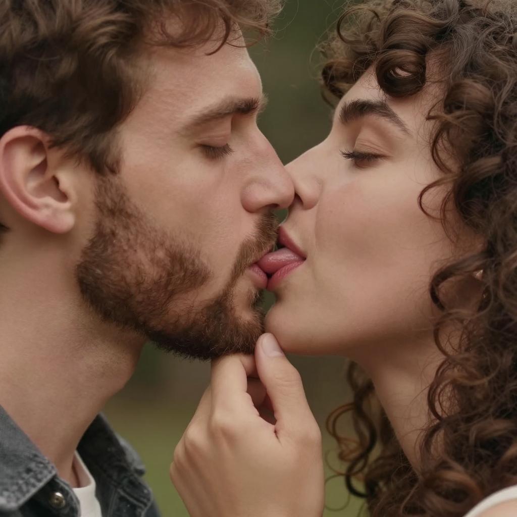 Shirtless man with brown beard and tousled hair, holding white string, gazes at smiling woman with short curly brown hair, wearing white lace top, outdoor stone building in background. Man on left, woman on right, standing close, holding string together.