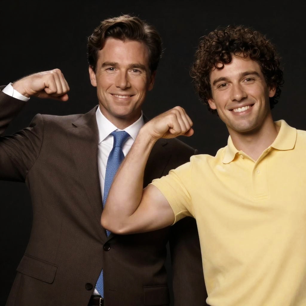 Photograph of two men with defined arm flexes. Man on left has wavy brown hair, wears brown suit, white shirt, blue tie. Man on right has curly brown hair, yellow polo shirt. Both smiling, dimly lit background.