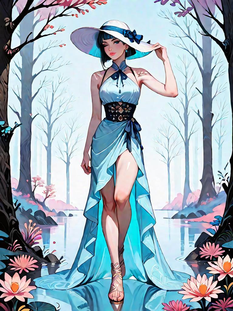 Full body, 1girl, dark_fantasy, medieval dark_forest, fog, torchlight, night mist ominous, comic Monokini, deep ocean blue, sleek one-piece design, high-cut legs, open back, soft sustainable nylon, adjustable straps, minimalist aesthetic, paired with lightweight sheer sarong, flowing fabric, pastel coral hue, delicate fringed edges, matching wide-brimmed sun hat, woven straw, natural fibers, elegant ribbon detail.