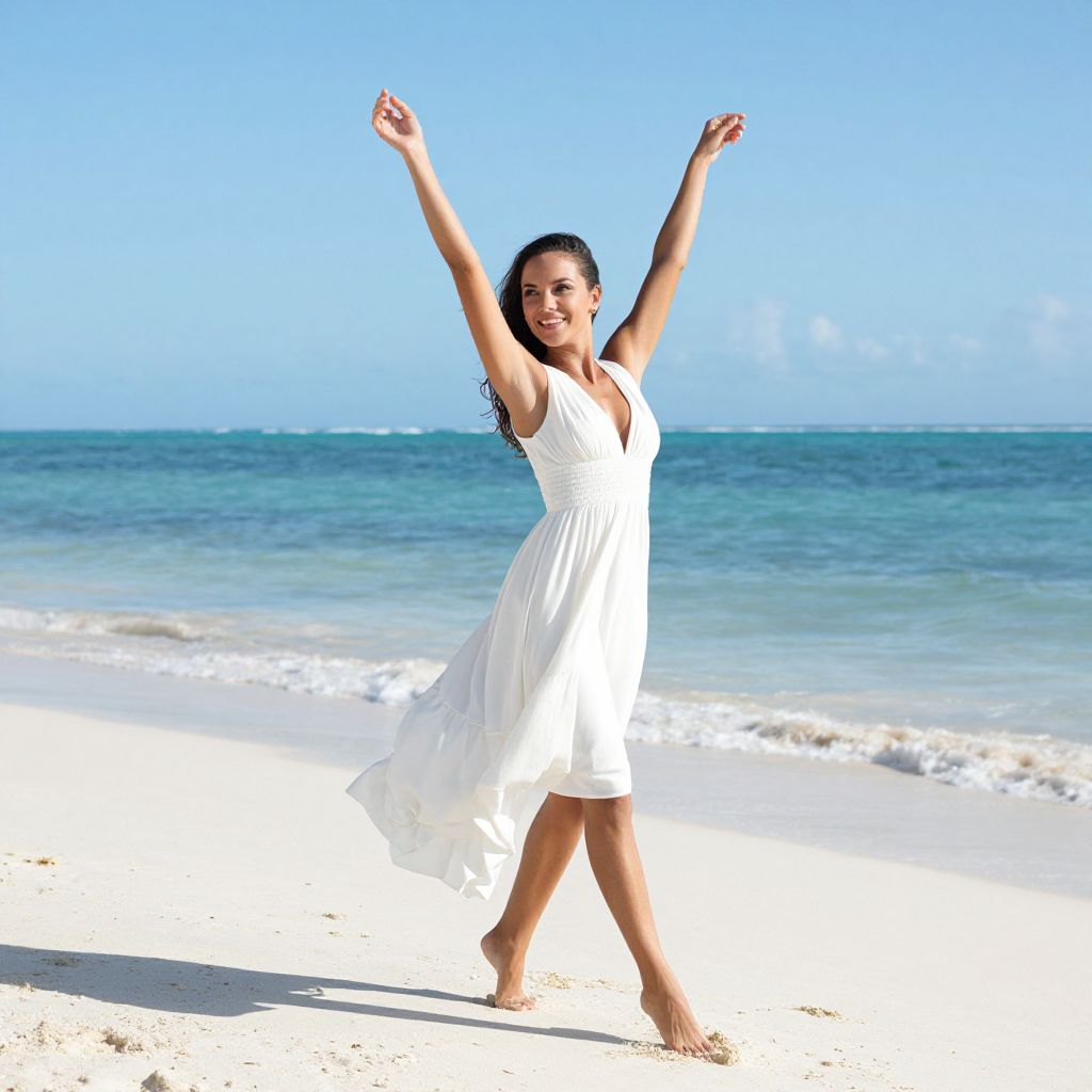 Photograph of a smiling woman with dark hair in a flowing white dress, arms raised, standing on a sunny beach with turquoise ocean and clear blue sky