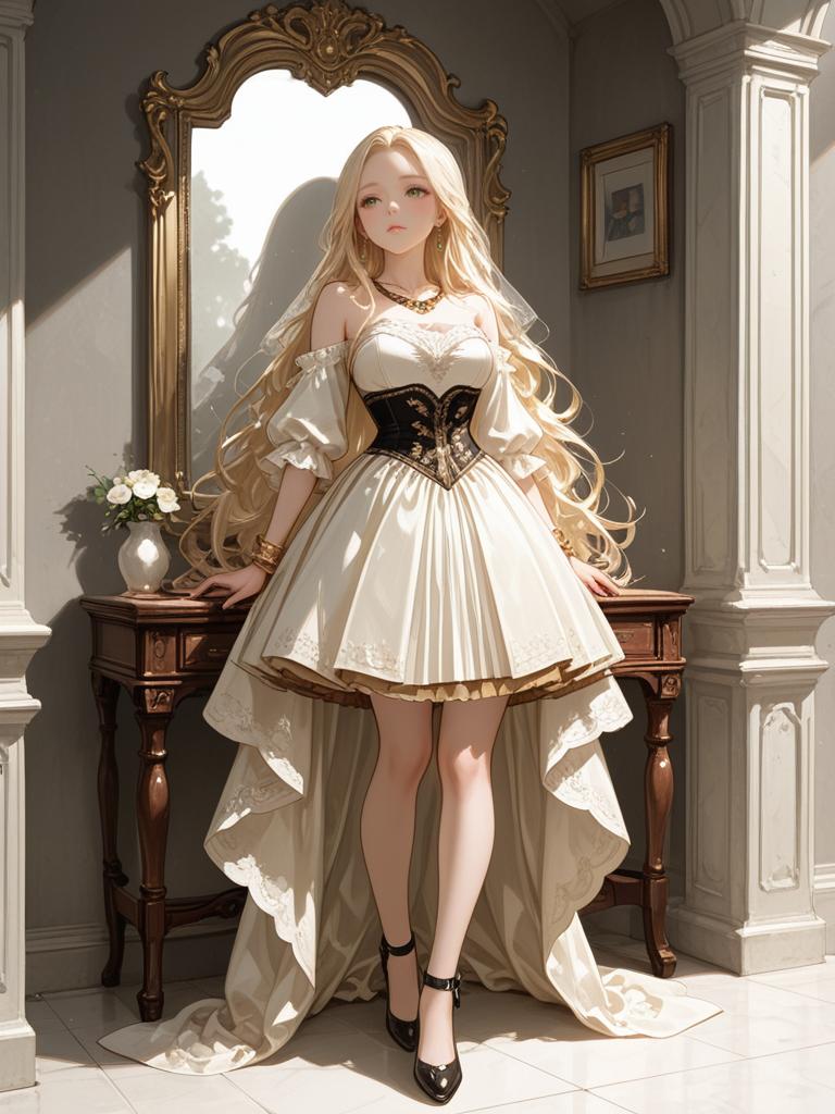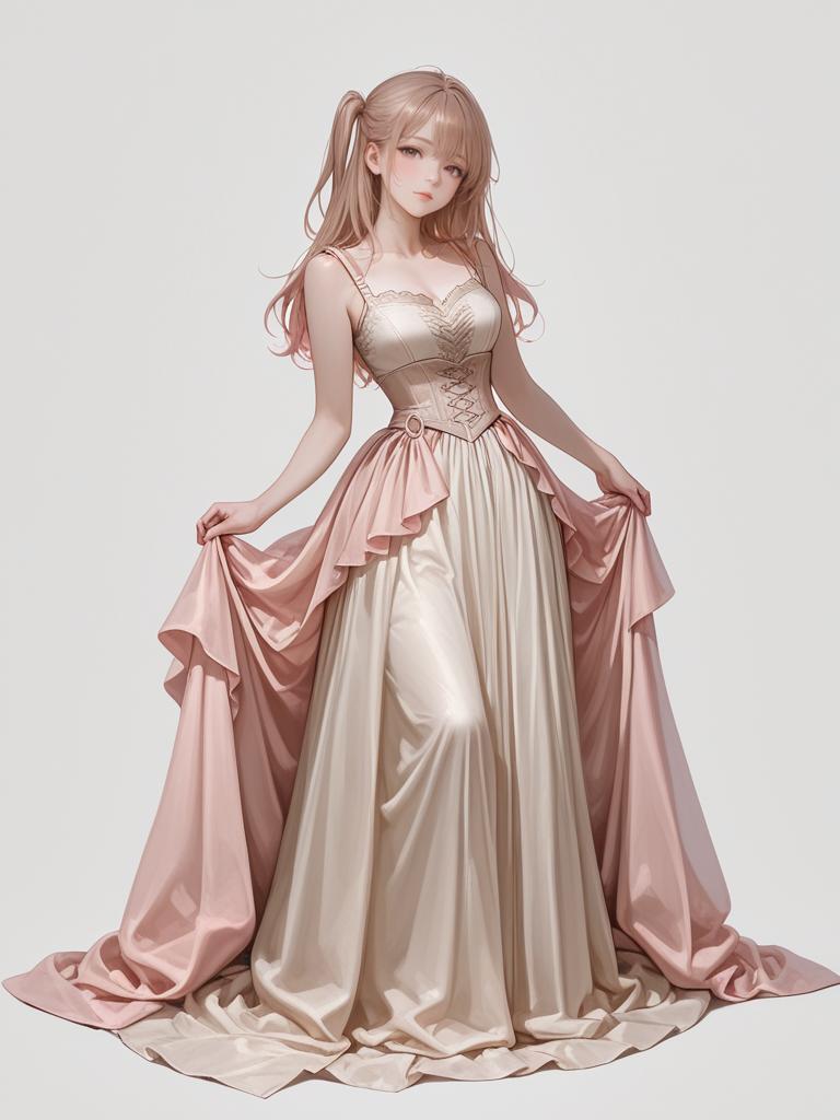 1girl, realistic face, full body shot, Woman, contemporary feminine, beige lace overlay dress, sleeveless on one side, draped chiffon panel across bodice, beige and pink thin belt at the waist, knee-length, fitted silhouette, white background.