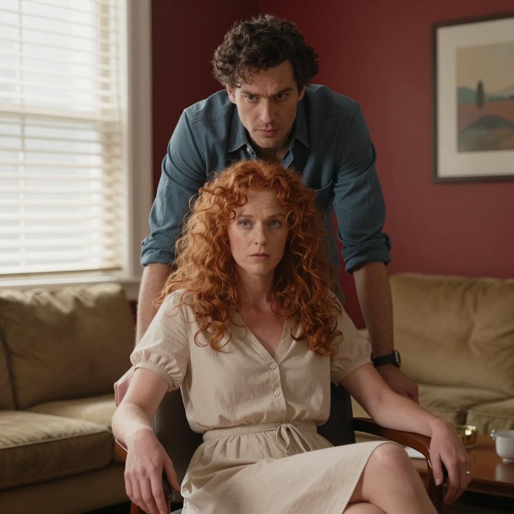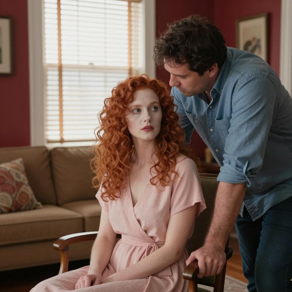 Woman with curly red hair, wearing a beige dress, sits in a chair. Man with dark hair, wearing a blue shirt, leans over her, looking at her intensely. Red wall, window with blinds, framed art, and a sofa in the background. Natural light from window.