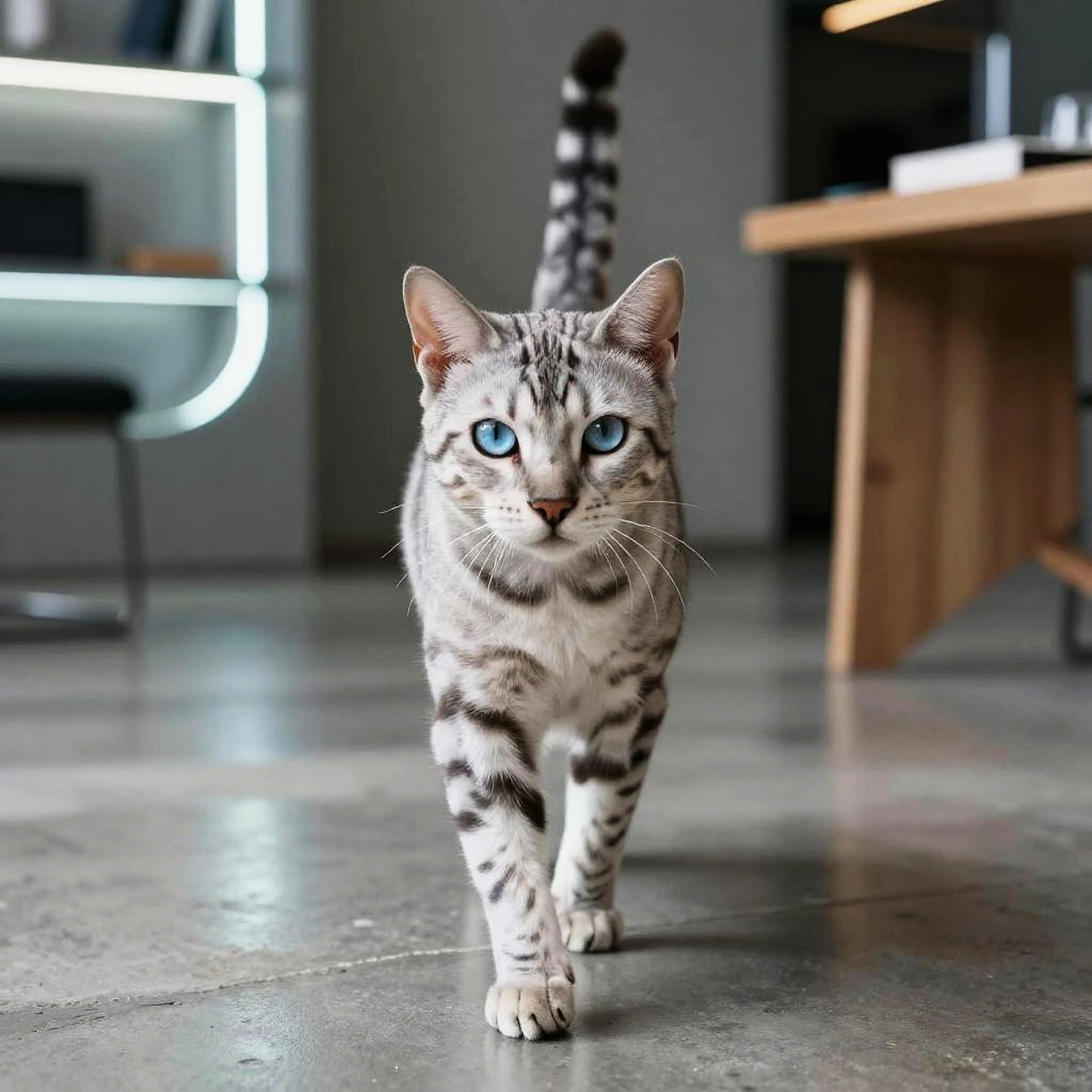 Sleek silver Bengal male cat with stunning ice-blue eyes confidently walking toward the viewer across high-tech modern loft with metallic furniture and polished cement floor, lit by cold neon light casting subtle futuristic glows. Natural textures of fur, fabric, and wood emphasized; inviting and homey atmosphere; shallow depth of field; crisp whiskers; soft vignetting; balanced composition; subtle film grain; realistic color rendering; gentle contrast; fine detail throughout.
