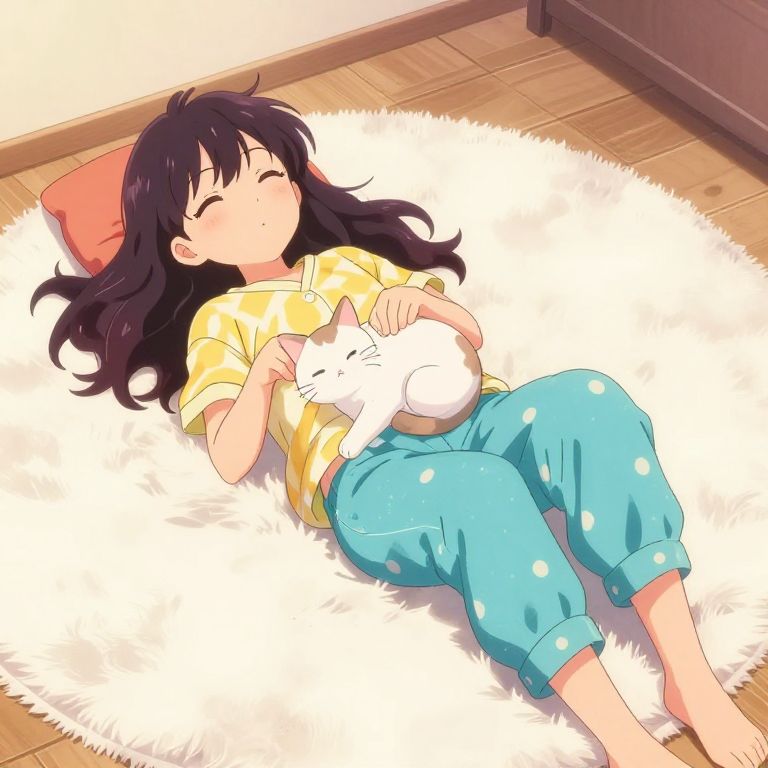 Anime girl lazy weekend, sprawled on a fluffy rug with a cat curled on her lap, wearing comfortable pajamas, vibrant colors and playful expression, cozy indoor setting