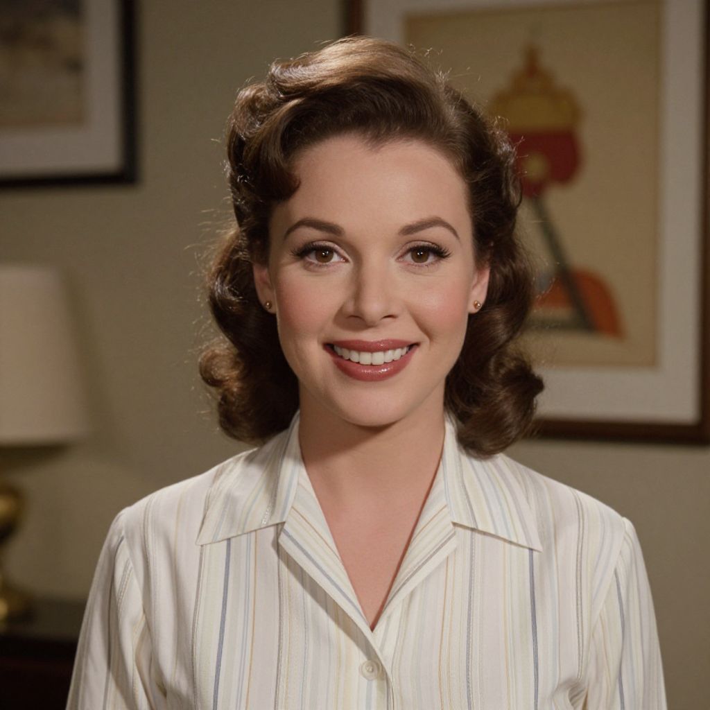 Woman smiling warmly with a vintage June Allyson-inspired hairstyle, wearing a crisp striped blouse against a softly lit background featuring framed artwork.