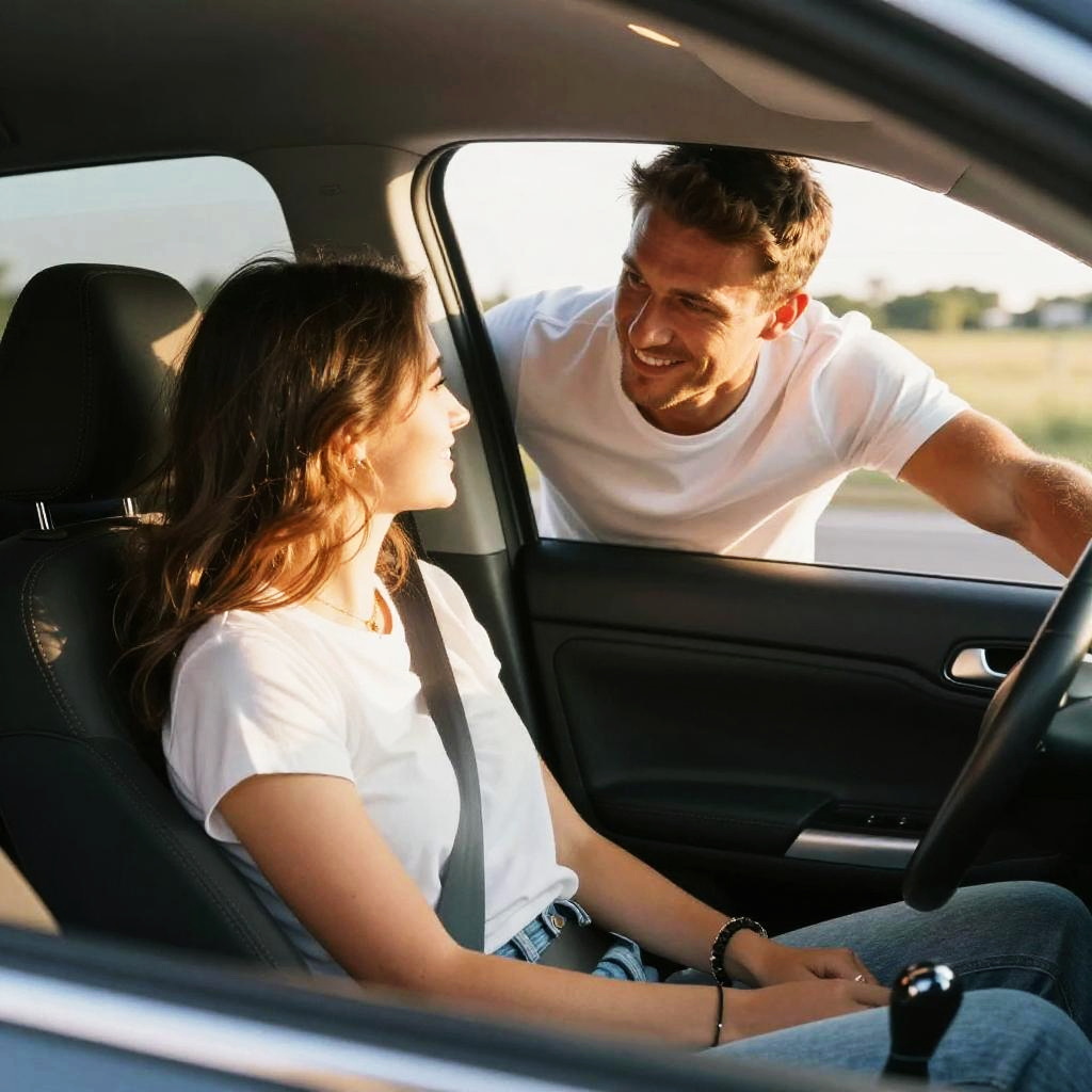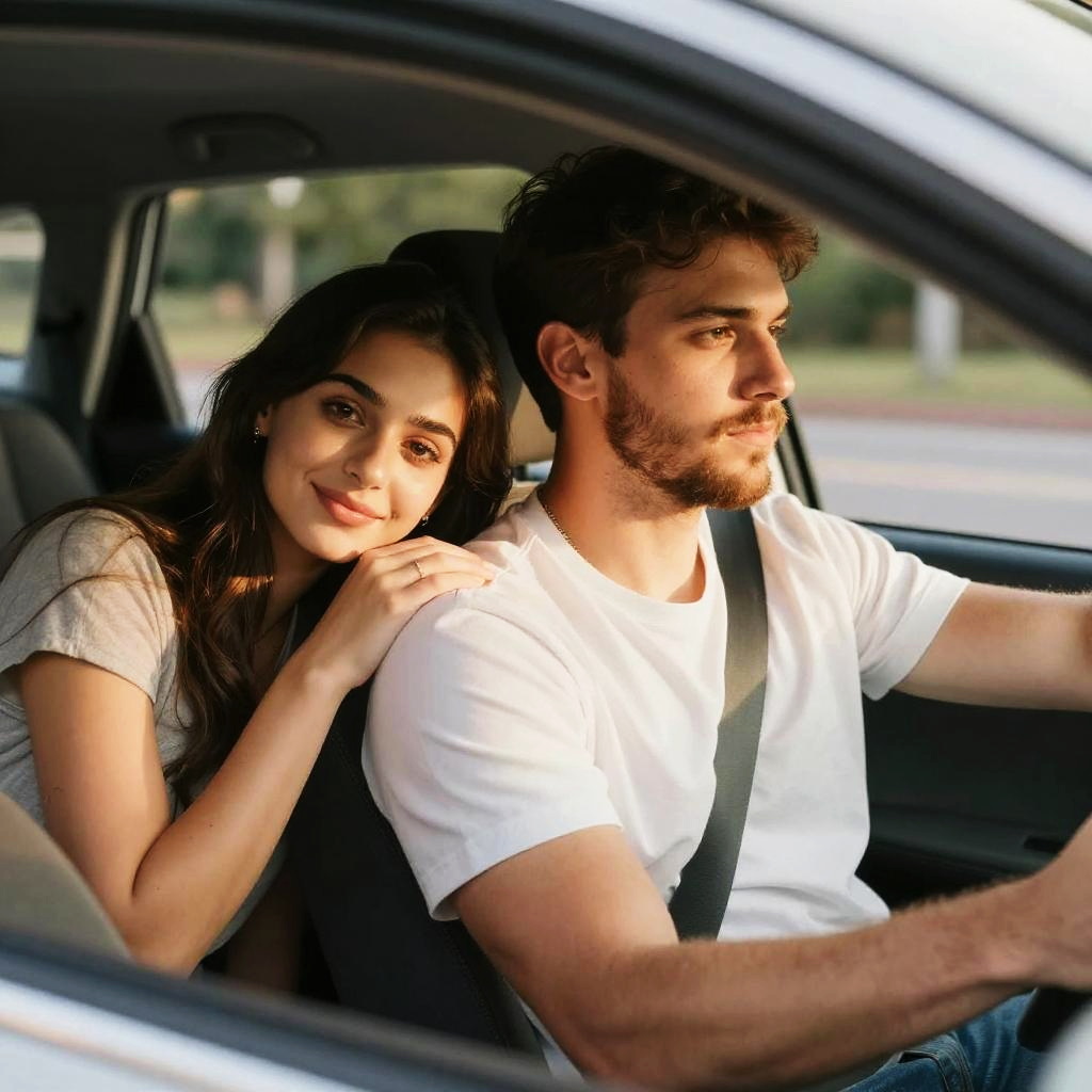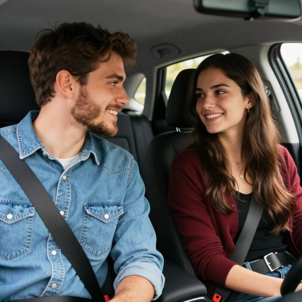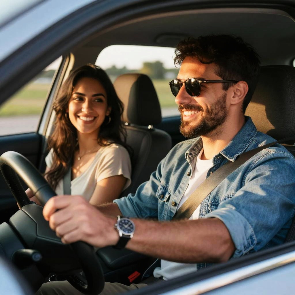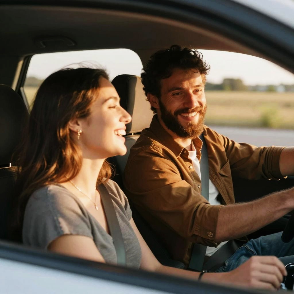 Photograph of a cute couple sitting in a car. The woman with long brown hair and light blue blouse smiles at the camera, while the bearded man in a white shirt grips the steering wheel, looking focused. The windshield is slightly foggy, and sunlight shines through, creating a bright, cheerful atmosphere. They look happy and relaxed.