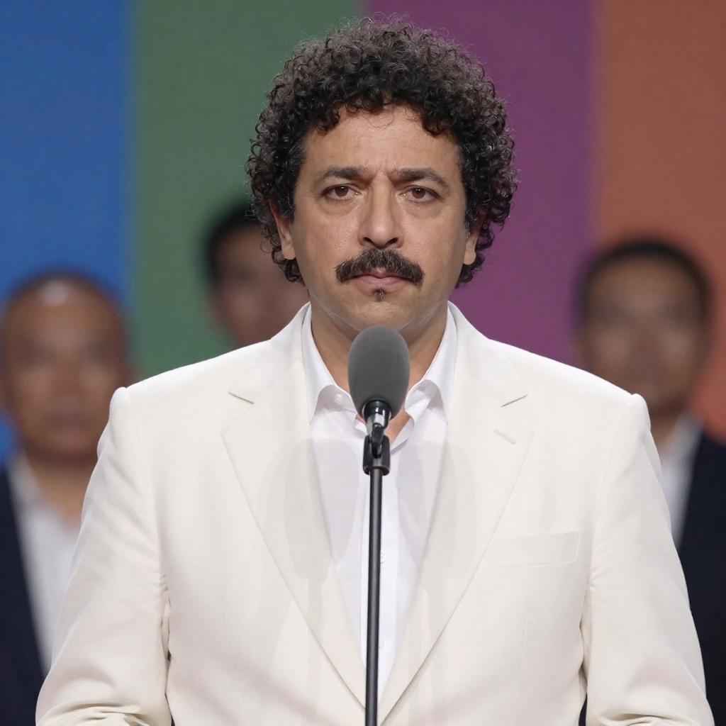 Photograph of a middle-aged man with curly dark hair and a mustache, wearing a white suit jacket over a white shirt, standing at a microphone. Background features blurred colorful lights and indistinct people. The man's expression is serious and focused. The lighting highlights his face and suit.