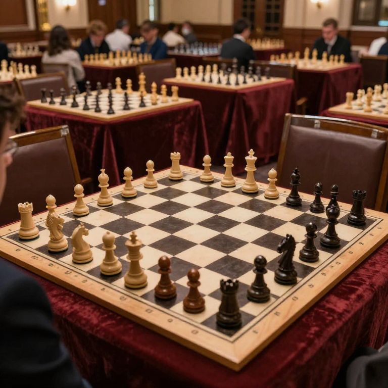 This photograph depicts a chess tournament in a dimly lit, elegant hall. In the foreground, a chessboard with alternating black and white squares is set on a maroon velvet-covered table, featuring black and white chess pieces in their starting positions. The background shows several more tables with chessboards and players, slightly out of focus, engaged in their games. Wooden chairs with dark brown cushions are positioned around each table. The walls are adorned with dark wood paneling, and soft, warm lighting enhances the room's classic ambiance. Players, mostly men, are dressed in formal attire, adding to the tournament's sophisticated atmosphere.