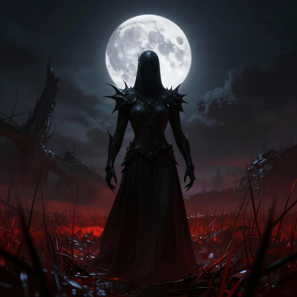 A digital fantasy artwork depicts a dark, armored warrior with a hooded helmet, standing menacingly in front of a full moon. The warrior's armor is heavily spiked and dark metallic, with a long, flowing black cloak. They hold a sword in their right hand. The background features a dark, cloudy sky with a bright, glowing full moon, casting an eerie light. Red, glowing grass and mist surround the warrior, adding a sinister atmosphere. The scene is dark, with the moonlight creating strong contrasts and shadows. The overall mood is ominous and heroic.