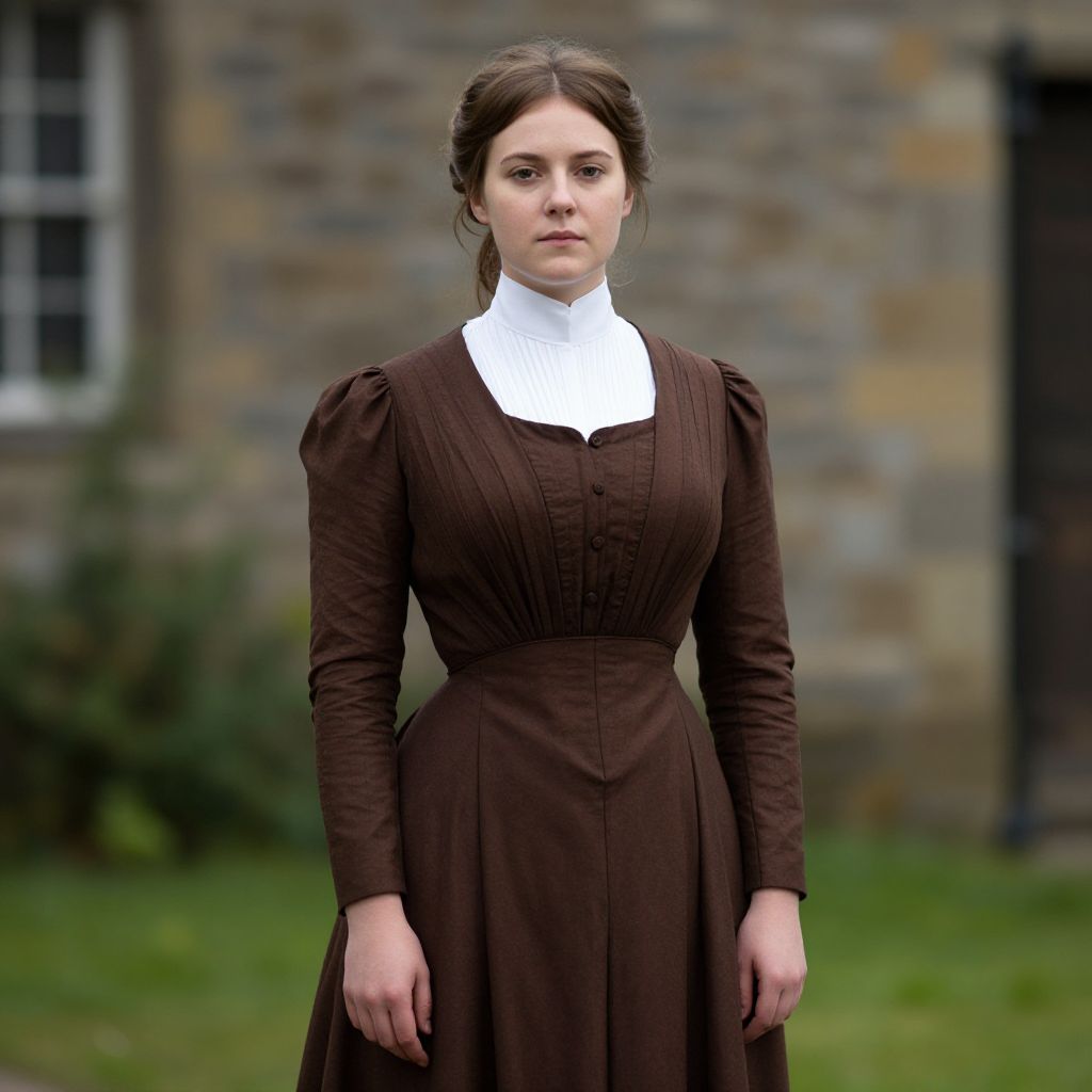 "Victorian Dress Historically Accurate, woman in a brown dress and white collared neck"