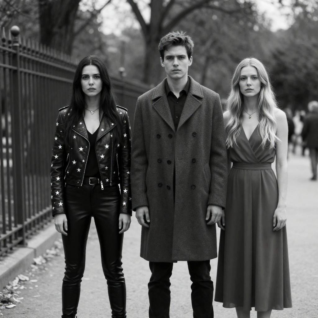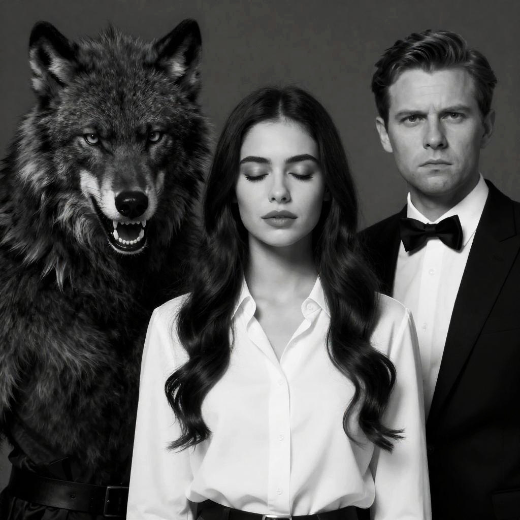 Black-and-white photograph featuring a serious young man with short hair wearing a dark jacket and a woman with wavy hair in a light-colored dress holding his arm. Behind them, a large werewolf with dark fur, a snarling face, and elongated limbs looms with arms outstretched. The blurred background suggests an outdoor or forest setting.
