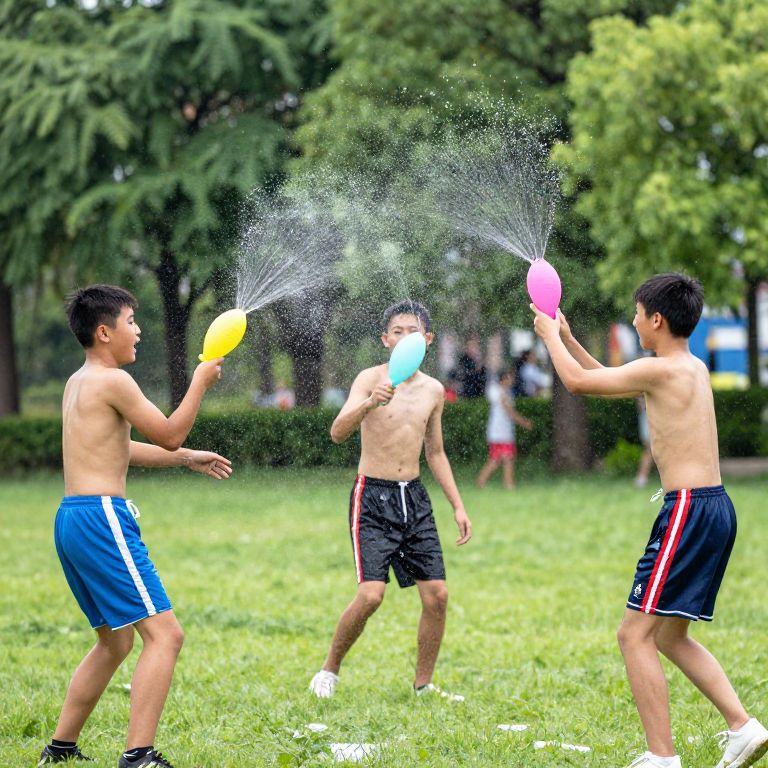 Shirtless middle school boys having a water balloon fight in a park, mid-action splashes, colorful balloons, energetic and carefree summer scene, vibrant and lively background