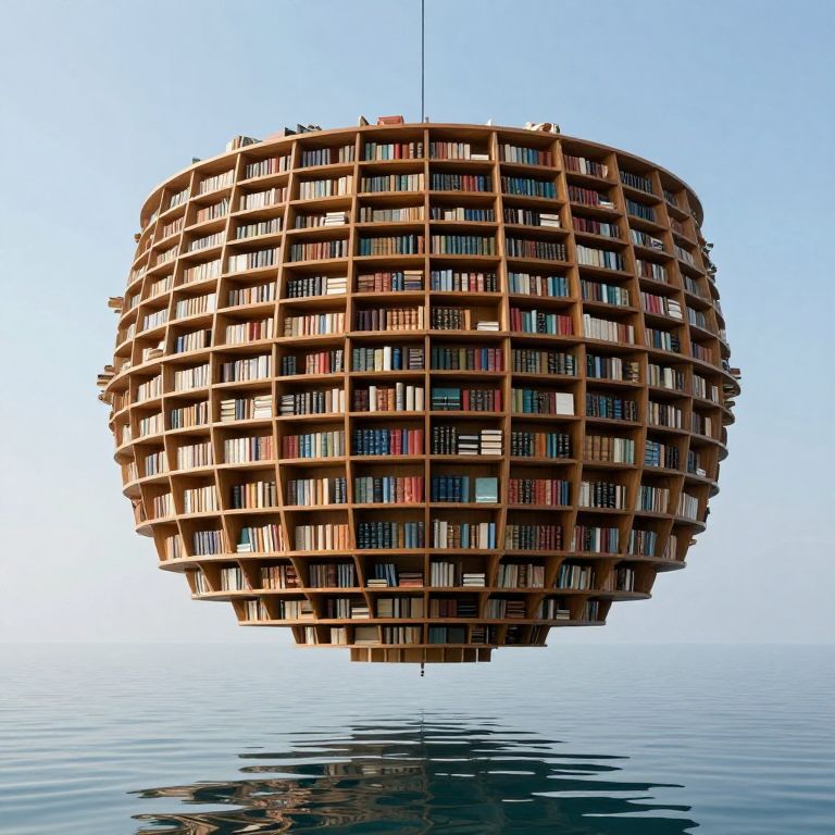 A colossal, suspended library of wooden shelves brimming with books hovers serenely above a tranquil sea, its reflection mirroring the impossible weightlessness of knowledge defying gravity.