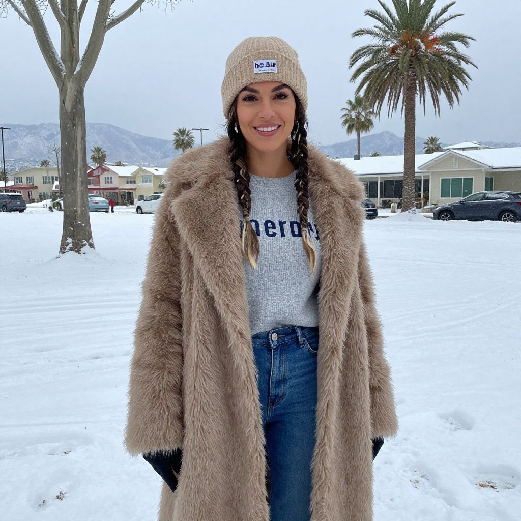 Photograph of a smiling young woman standing in a snowy suburban neighborhood. She has long, braided brown hair and wears a beige knit beanie with a blue logo, a light gray "Canada" sweater, high-waisted blue jeans, and a luxurious, tan faux fur coat. Her hands are in her coat pockets. In the background, there are snow-covered palm trees, a few parked cars, and single-story houses. The sky is overcast, and distant mountains are visible. The contrast between her warm, textured clothing and the cold, white snow creates a striking visual effect.