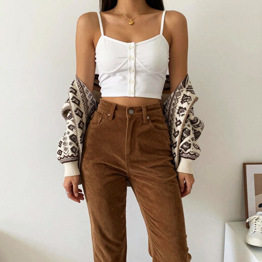 A woman models a casual chic outfit featuring a cropped white bustier top with thin straps and button detailing, paired with high-waisted brown corduroy pants. She completes the look with a patterned cardigan draped over her shoulders and white sneakers, embodying a relaxed yet fashionable style.