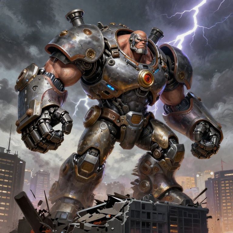 A dynamic digital illustration depicts a colossal, metallic, superhero-like robot standing amidst a devastated cityscape. The robot, with a muscular build and glowing blue and orange accents, has a bald head and a fierce expression. Its shiny, silver armor features intricate mechanical details and large gauntlets. The background shows a stormy sky with vivid lightning bolts illuminating the scene, adding dramatic tension. Crumbling buildings with shattered windows and debris surround the robot, emphasizing its immense size and strength. The cityscape includes tall, darkened skyscrapers, enhancing the sense of destruction and scale. The overall style is hyper-realistic with a focus on dynamic action and dramatic lighting.