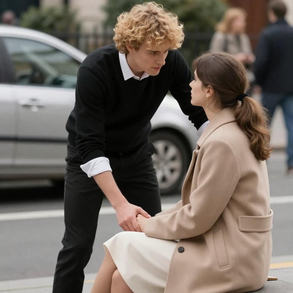 Photograph of a man with curly blonde hair, black sweater, white shirt, and black pants, leaning over a woman with brown hair in a ponytail, beige coat, and white skirt, seated on a city street. He holds her hand and looks at her intensely. Background includes a silver car, pedestrians, and greenery. Man's left hand on her waist, woman looking up at him.