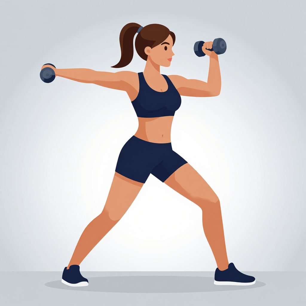 Digital illustration of a fit woman performing a weightlifting exercise. She has light skin, brown hair in a ponytail, and is wearing a dark blue sports bra and matching shorts with black ankle socks and shoes. She holds a small blue dumbbell in each hand, extending her right arm forward and her left arm backward while standing in a wide stance. Her facial expression is focused and determined. The background is a simple gradient from white to light blue, emphasizing the subject. The image uses bold, clean lines and vibrant colors.