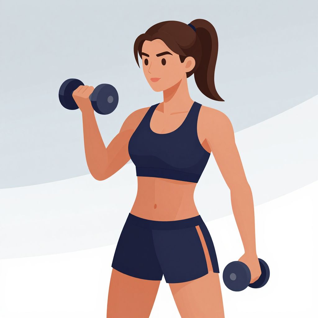 A vibrant vector illustration depicts a fit brunette woman in athletic attire performing a dumbbell exercise, showcasing her toned physique against a clean, minimalist background with smooth gradients and bold colors.