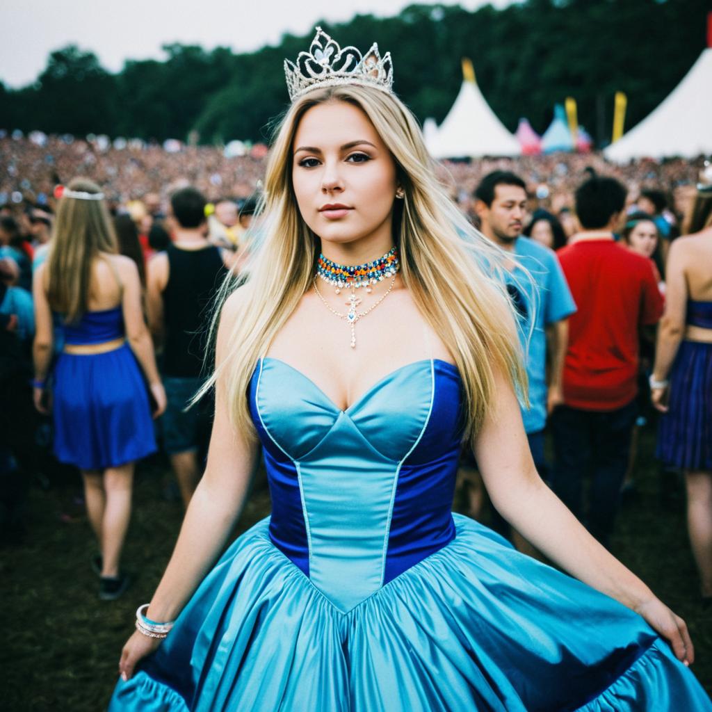 Beyond wonderland rave,dress, blonde hair, 1girl, long hair, solo focus, crowd, looking at viewer, tiara, blue dress, multicolored dress, choker, multicolored clothes, blurry, crown, bare shoulders