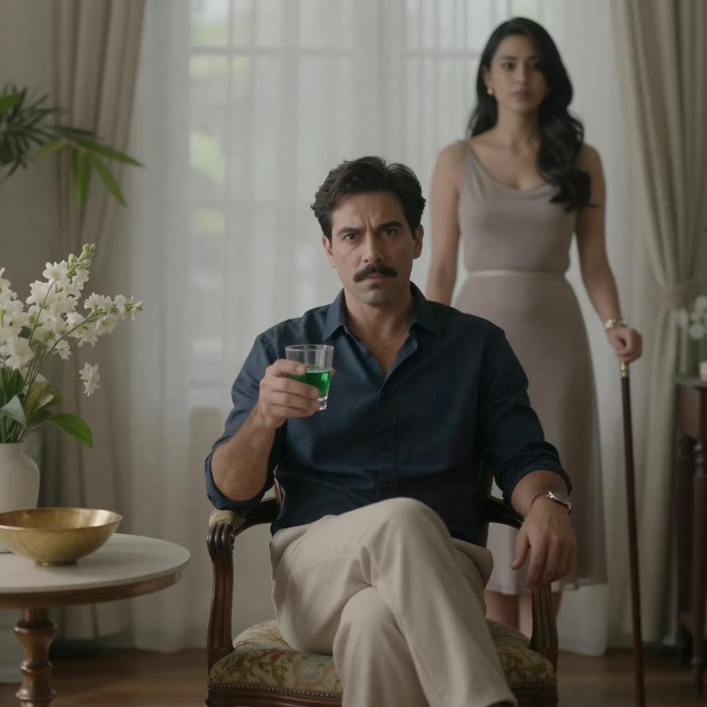 Photograph of a man with short dark hair and a mustache, wearing a navy shirt and beige pants, sitting in an ornate chair, holding a glass with green liquid, right arm extended. Background woman in a sheer dress holds a cane, standing by large windows with sheer curtains. Potted plants, white flowers, and a gold bowl on a round table. Man's expression is serious, woman's expression is neutral. Both are centered, man in foreground, woman in background.