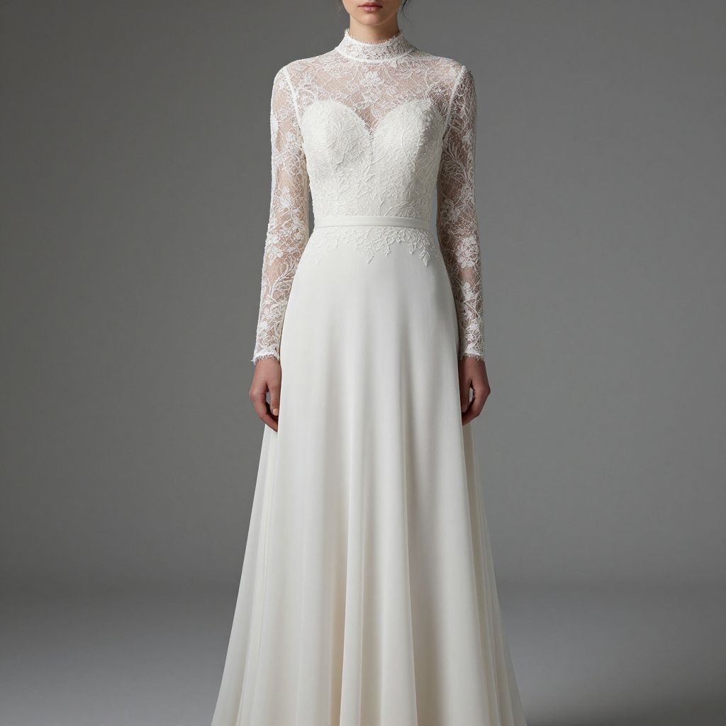A woman elegantly showcases a high-necked, long-sleeve wedding dress featuring intricate lace detailing on the bodice and a flowing chiffon skirt, embodying a refined and timeless bridal style with a subtle, minimalist aesthetic.
