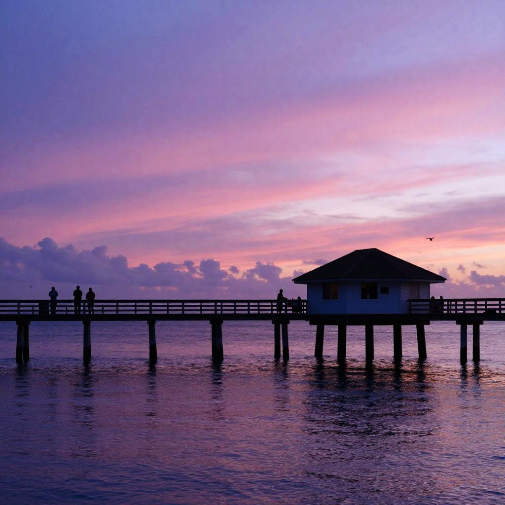 Purple Florida sunset behind iconic pier, glowing sky blending pinks and purples, calm sea mirroring vibrant colors, silhouettes of fishermen and seagulls, peaceful end to a perfect tropical day