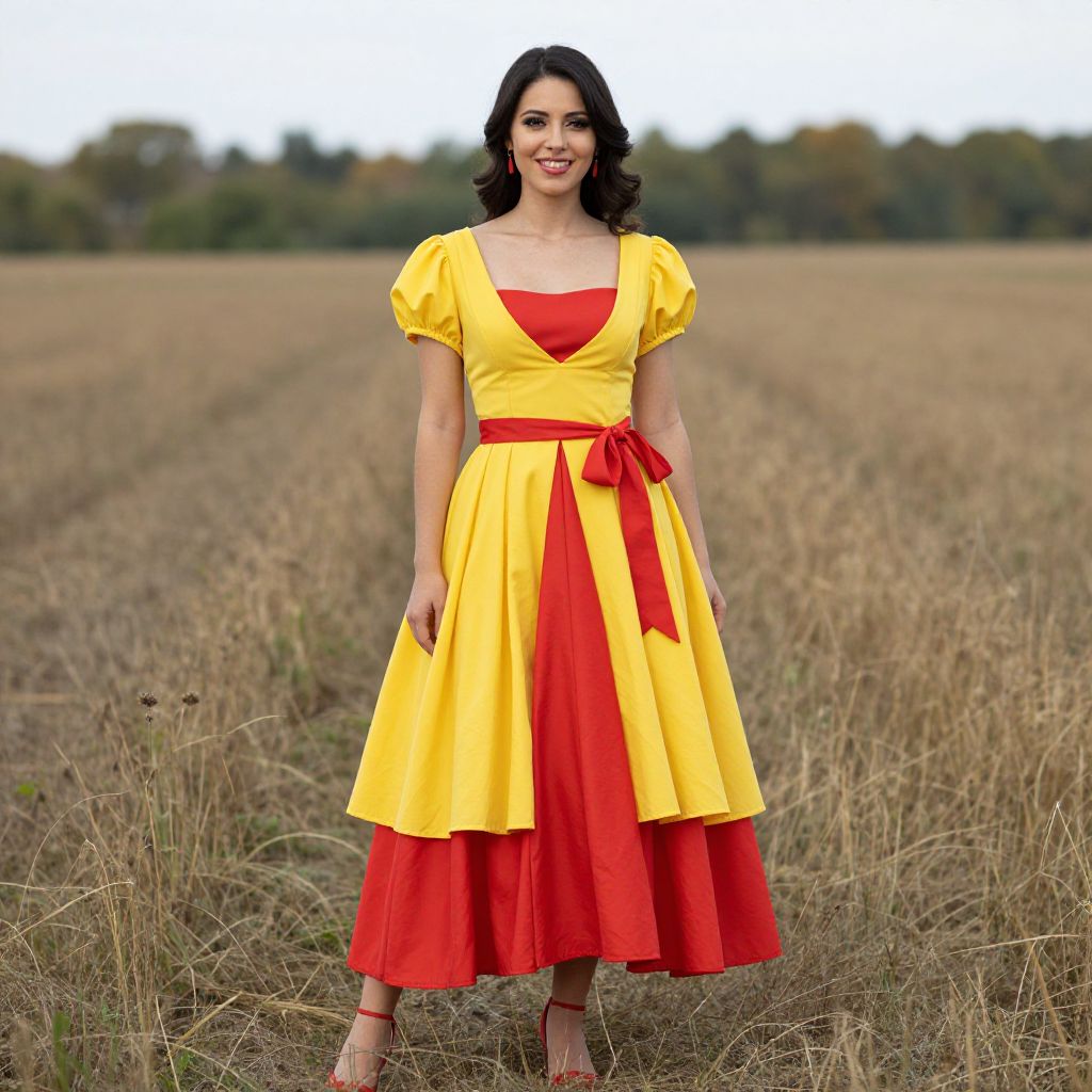 "Vilma Costume, a woman in a yellow and red dress standing in a field"