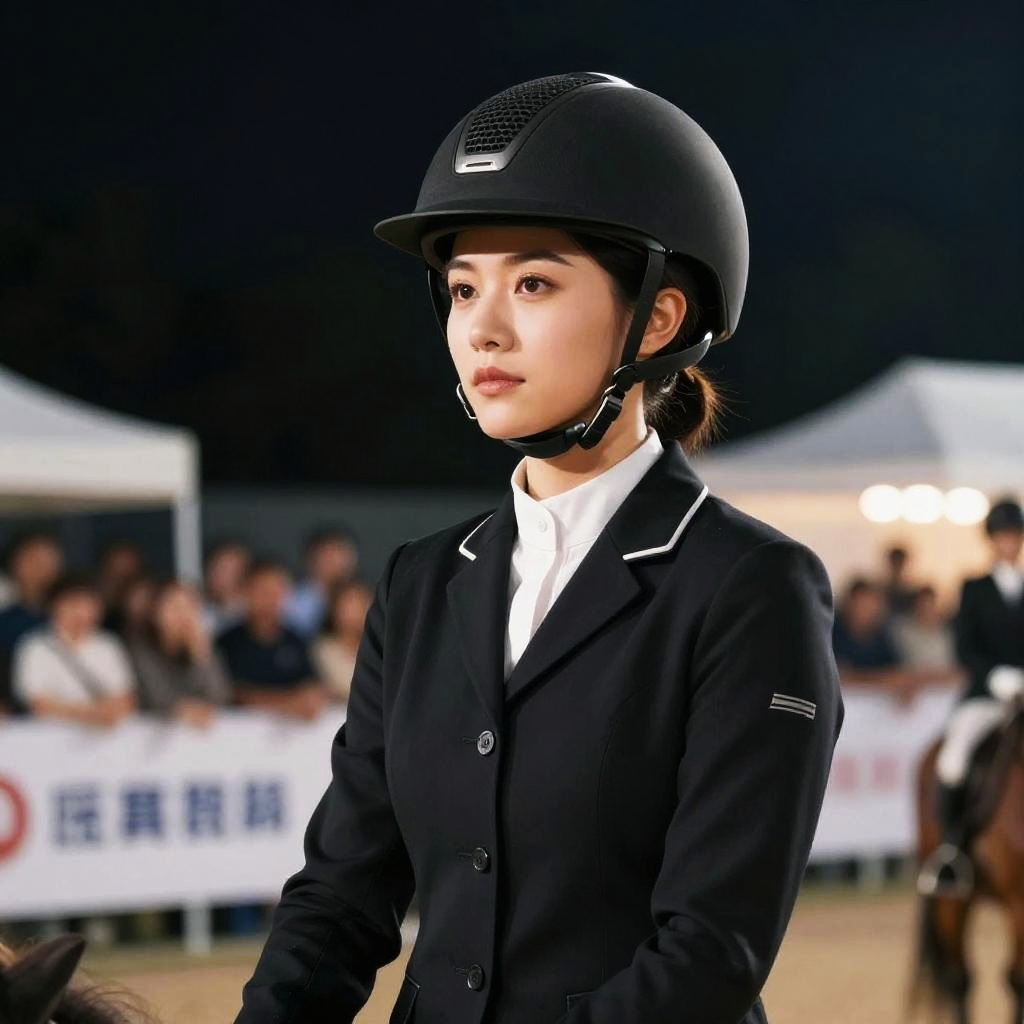 Portrait of an Asian young woman wearing a black equitation outfit and helmet, standing confidently at an outdoor equestrian event at night. She is captured in sharp focus with cinematic soft lighting and a blurred crowd in the background.