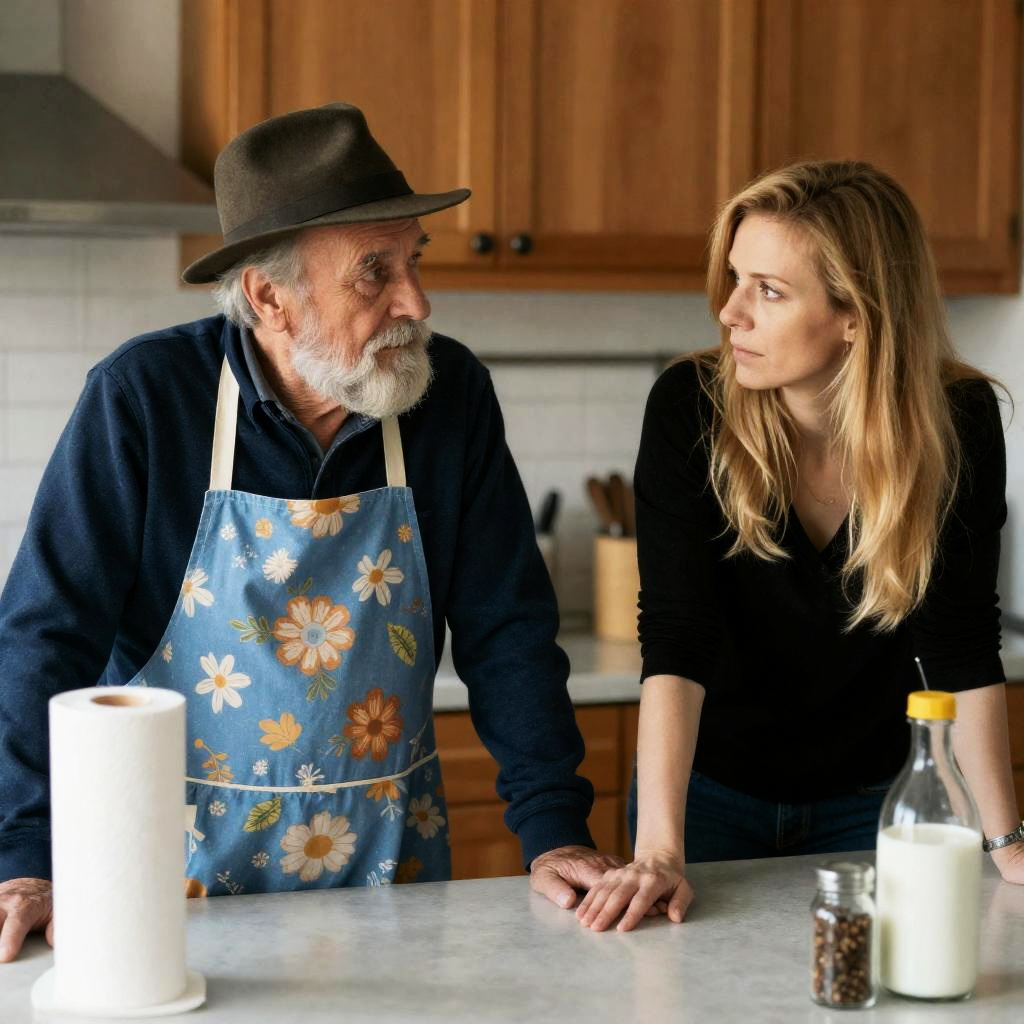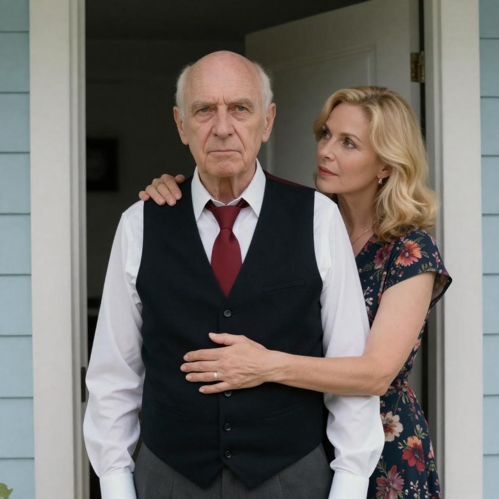 Photograph of an older man with receding gray hair, wearing a light shirt, looking intently at a blonde woman with short hair, wearing large hoop earrings, in profile view. Both have serious expressions. Dark background. Man on left, woman on right.