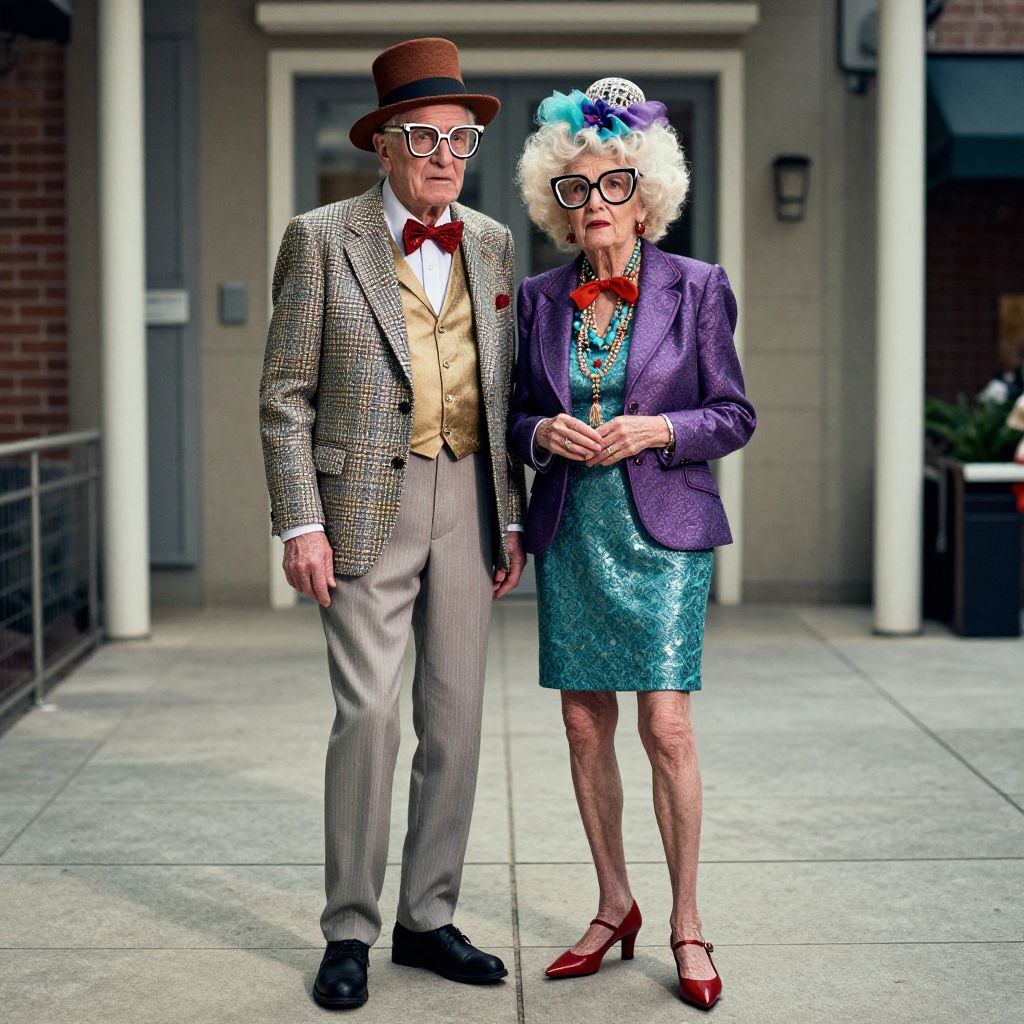 Photograph of an elderly white couple standing outdoors on a concrete path. The man wears a brown bowler hat, checkered jacket, beige vest, white shirt, red bow tie, and gray pants, with black shoes. The woman has curly white hair adorned with a blue and white flower, wears glasses, a purple blazer over a teal sequined dress, red high heels, red bow tie, and a long necklace. Both have light skin and appear to be smiling gently. Background includes a brick building with a door and a lamp on the wall. The image has a slightly exaggerated, vibrant color style.