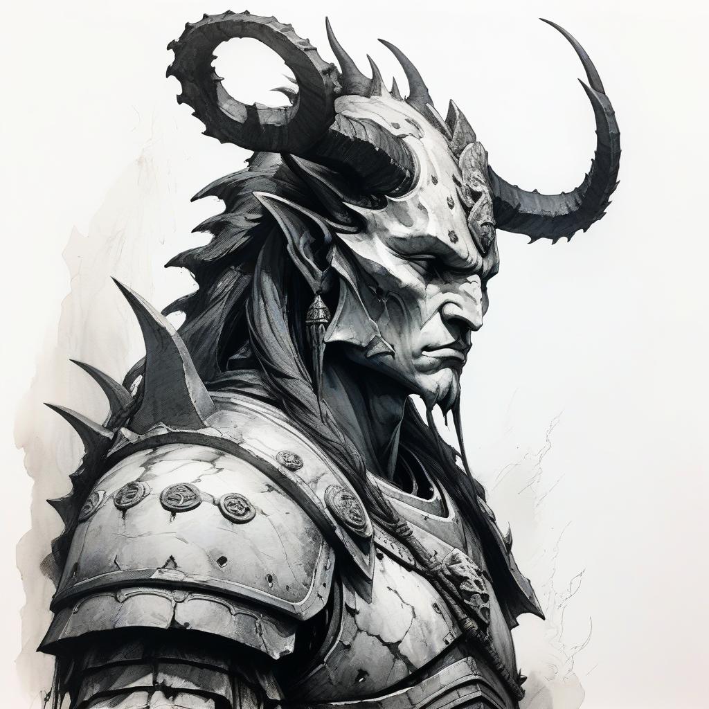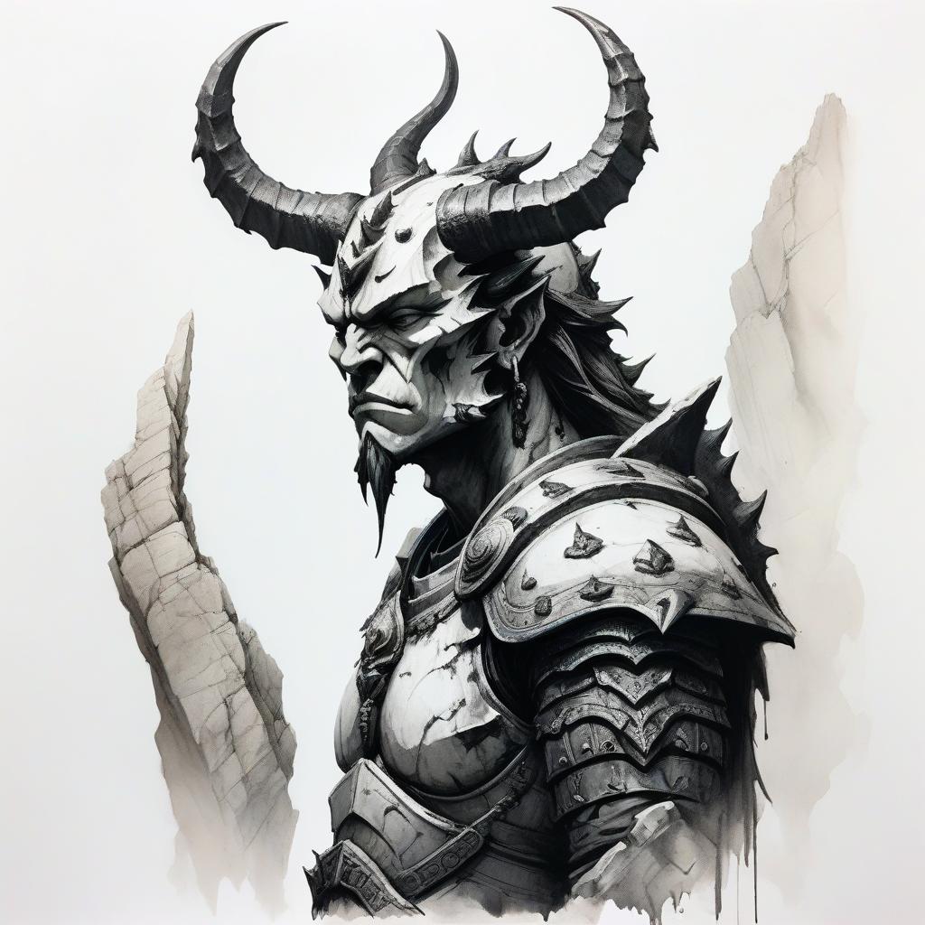 Grimdark ink drawing of a tall stone statue of a horned warrior with three faces (one on shoulder, one on stomach) all crying. Statue has a dragon tail, wears battle armor, rough hewn stone texture, white background, inspired by Stephen Gammell
