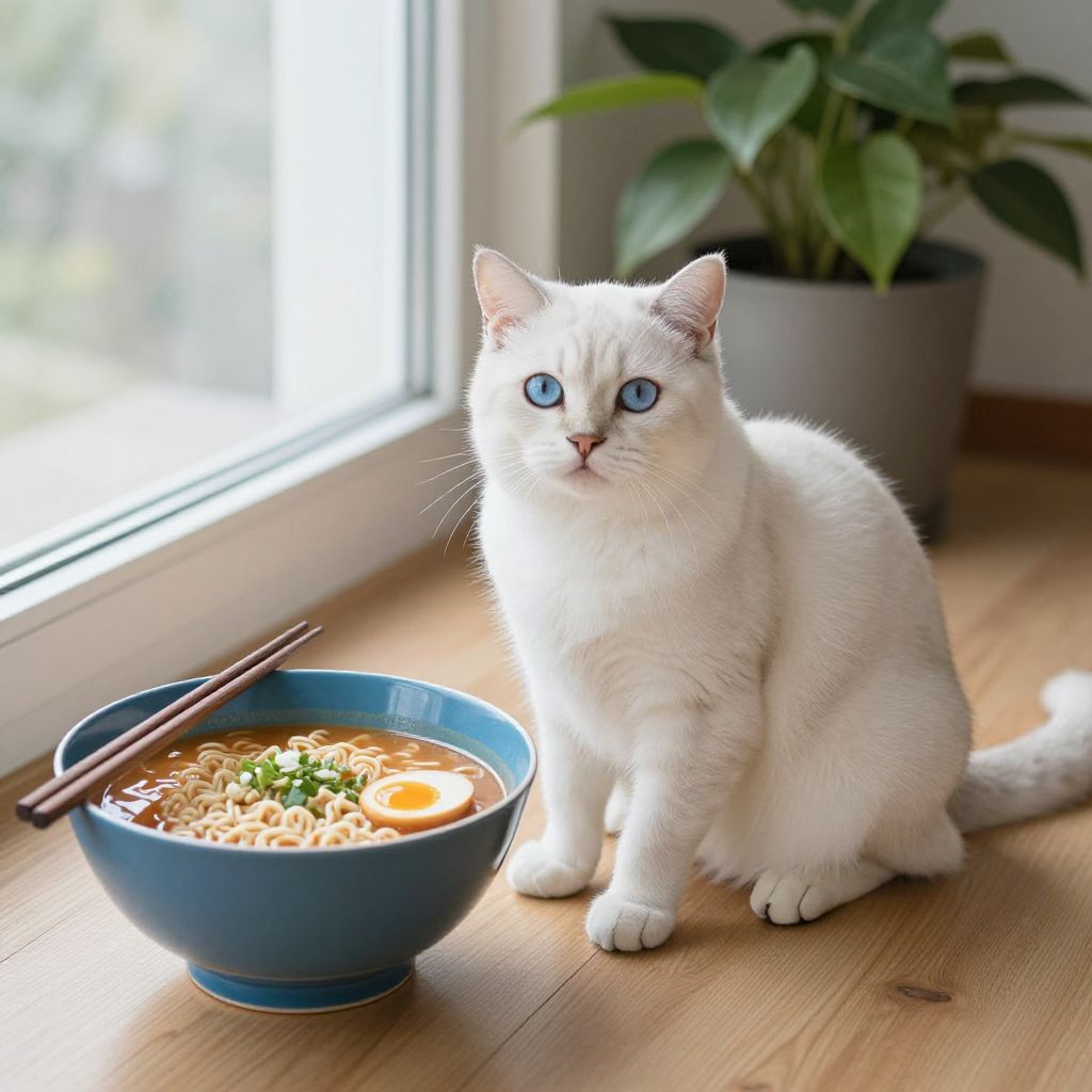 White Cat with Blue Eyes Next to Ramen Bowl