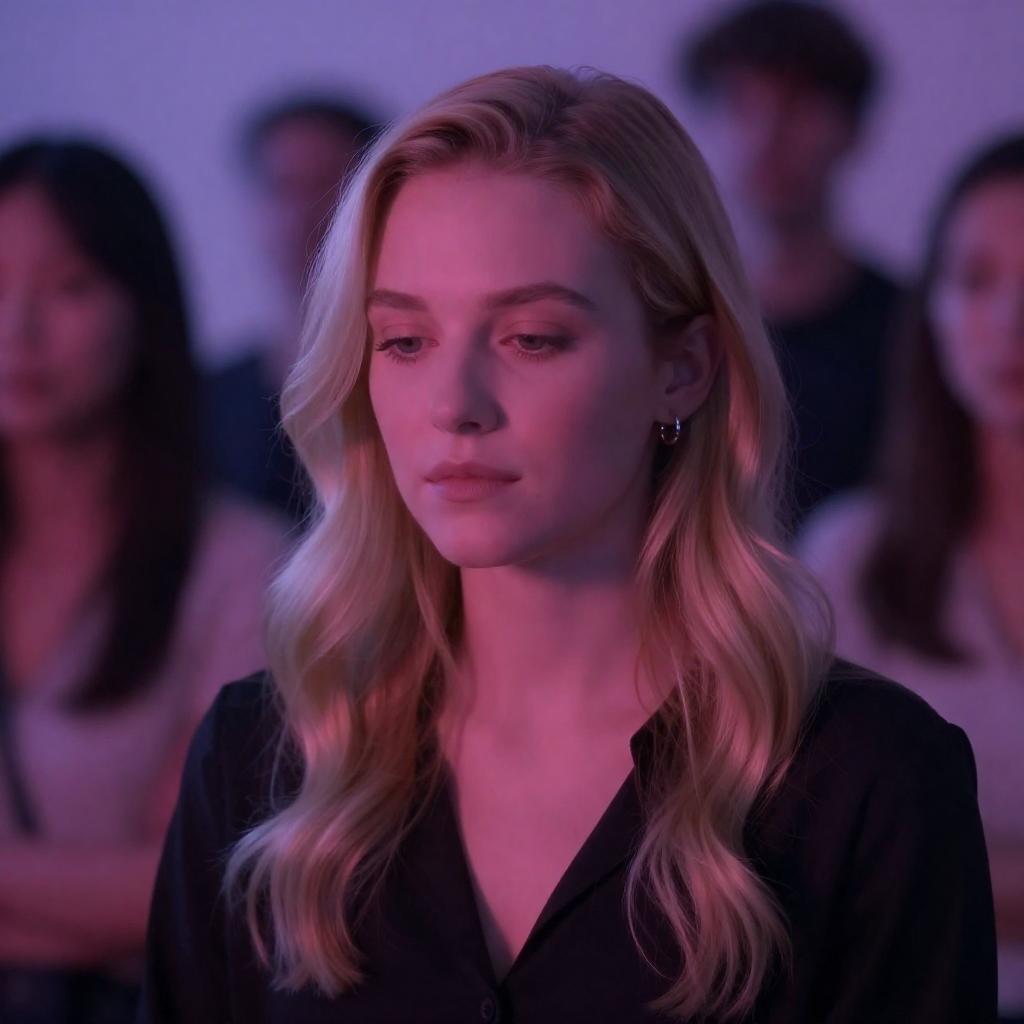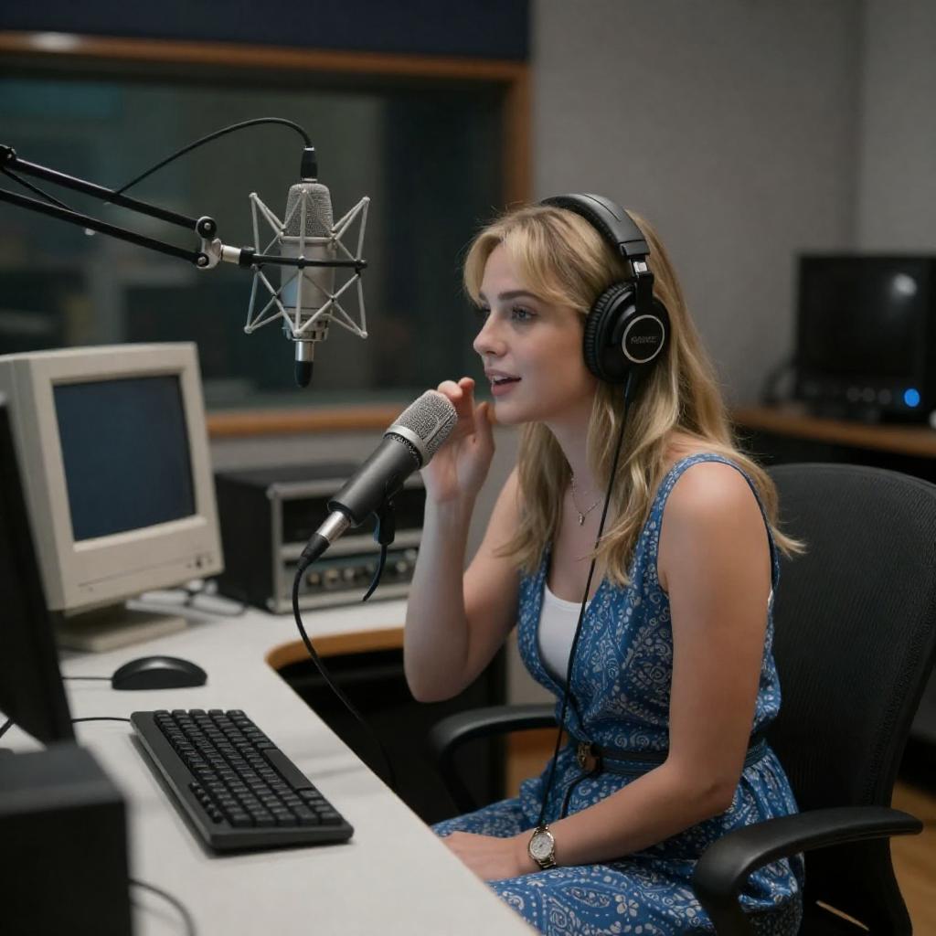 Woman with blonde hair, wearing headphones and a blue patterned dress over a white top, sitting at a recording studio desk. She is holding a microphone close to her mouth. Multiple microphones are attached to stands above the desk. Old computer monitor and equipment are in the background. Cool, industrial lighting.