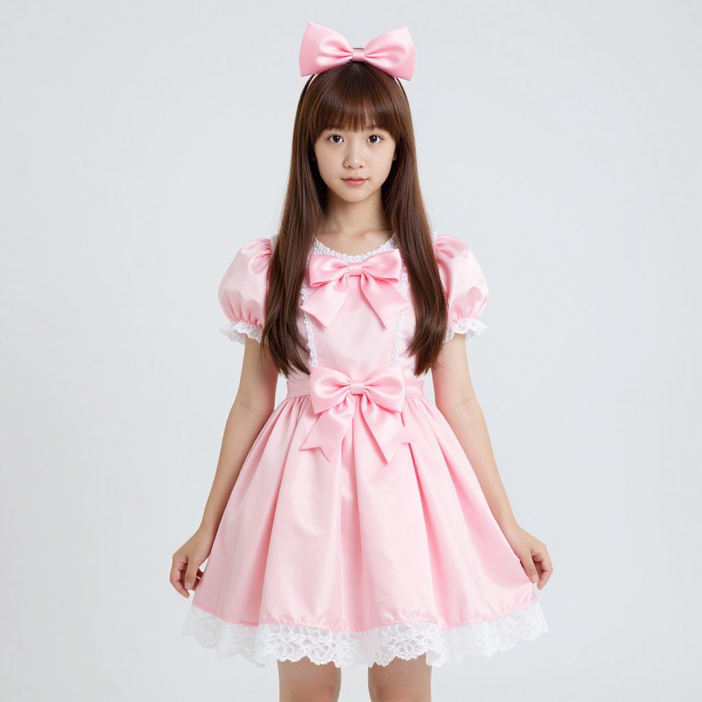 Photograph of an Asian girl with long, straight, dark brown hair and blunt bangs, wearing a pink, short-sleeved, satin dress with a large bow at the chest and another bow on her head. The dress has a white lace trim at the hem and is gathered slightly at the waist. She stands against a plain white background, facing the camera with a neutral expression. The lighting is bright, emphasizing the smooth texture of the satin fabric. The girl's skin is fair, and her eyes are slightly almond-shaped.