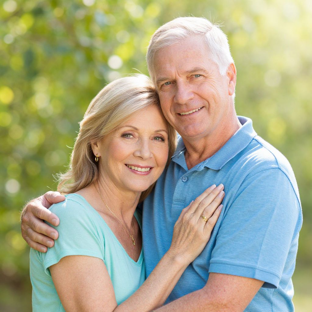 Smiling older couple embracing warmly outdoors, with the man's arm affectionately wrapped around the woman's shoulder and her hand gently resting on his chest, set against a soft-focus backdrop of vibrant greenery and sunlight.