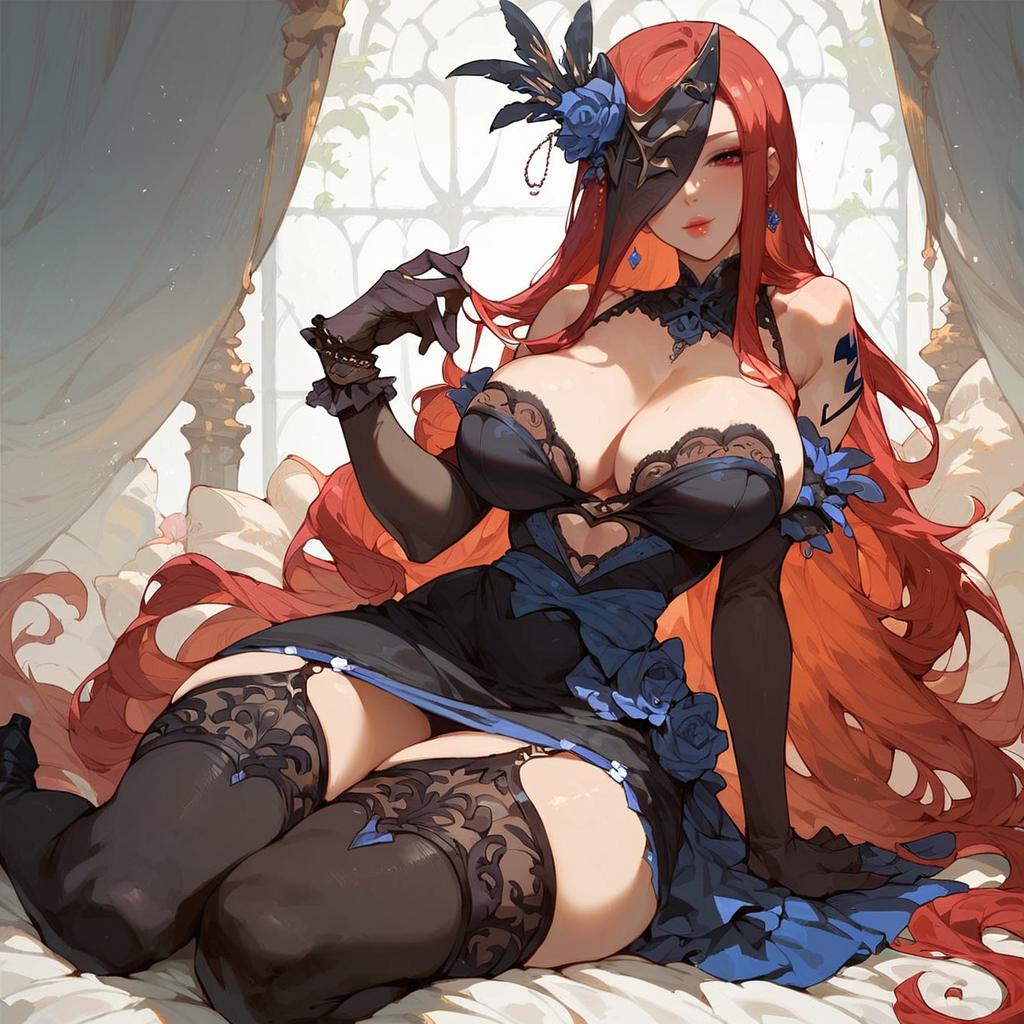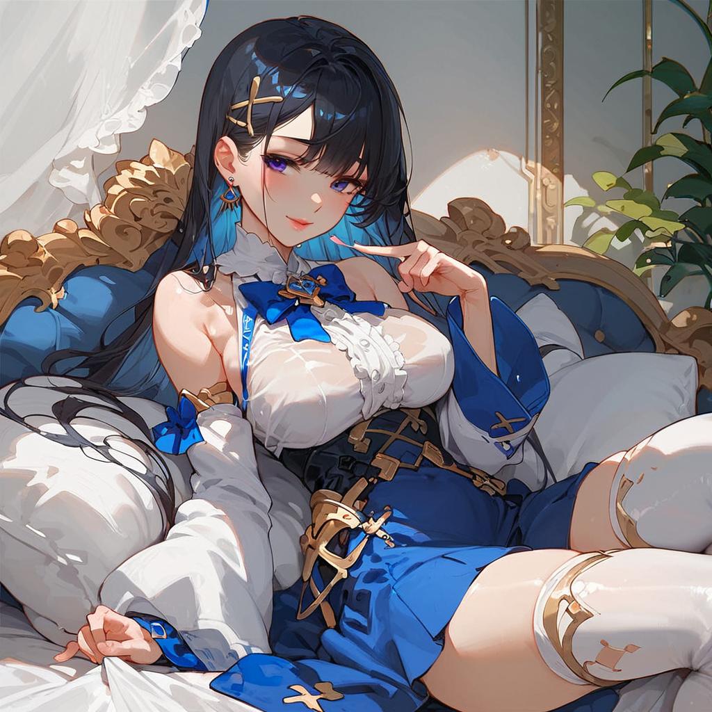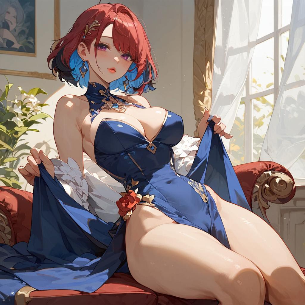 Digital artwork of an anime-style woman with auburn and blue-highlighted hair seated on a red ornate sofa in a warmly lit interior. She is wearing a formal dark blue dress with floral details and a narrow waist, showcasing thick thighs. The background features a large window with sheer curtains and some indoor plants.