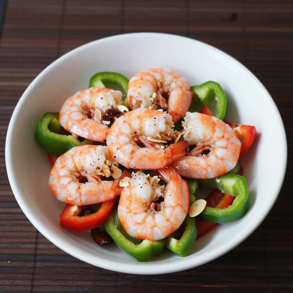 A close-up photo of a white bowl filled with a colorful shrimp salad. The salad has large pink shrimp, green bell peppers, red bell peppers, and chopped almonds, all sprinkled with black pepper. The bowl is set on a dark, textured bamboo mat, giving a rustic feel. The bright colors of the salad pop against the white bowl and dark mat.