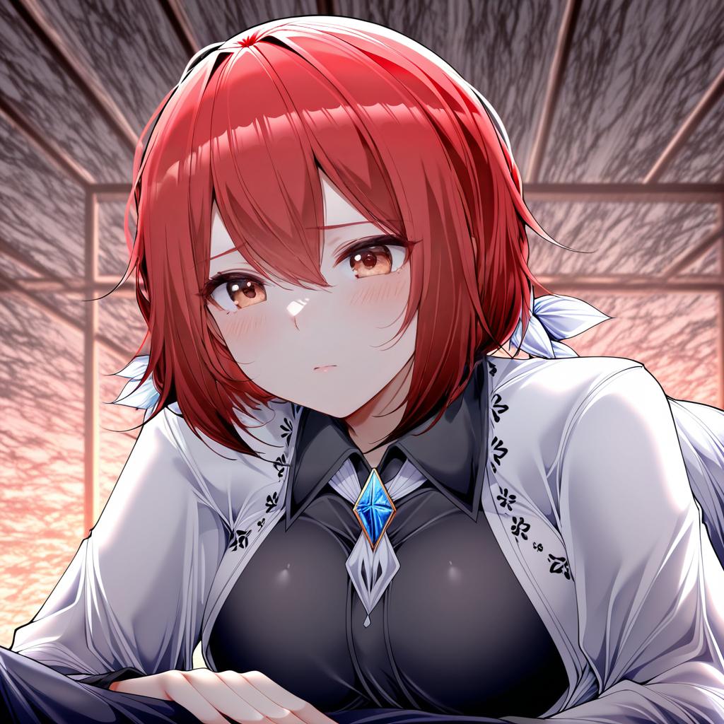 Digital illustration of a red-haired anime girl with short hair and brown eyes. She is wearing a white and black outfit adorned with floral patterns and a blue gemstone pendant. The background features a softly lit indoor setting with a textured wall.