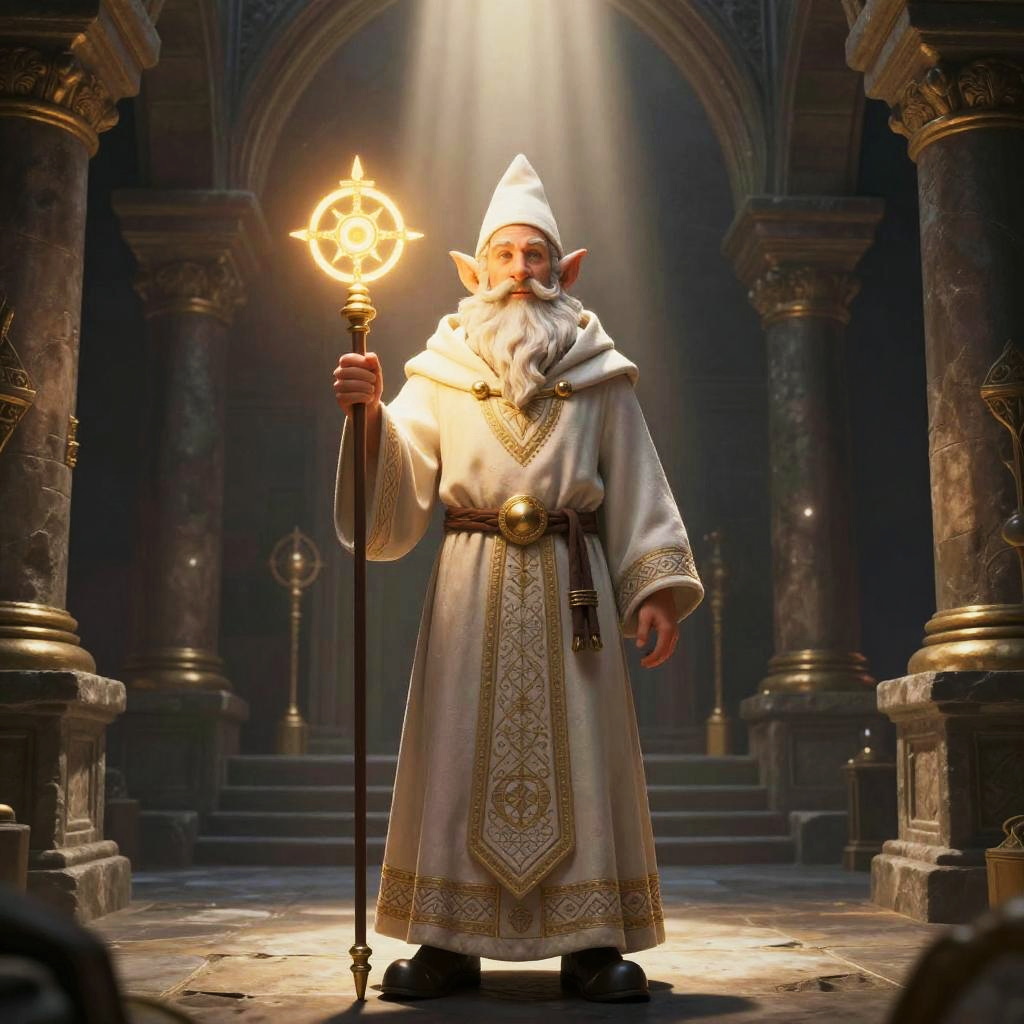 DND male gnome cleric standing in an ancient stone temple, holding a glowing holy symbol, robes adorned with intricate embroidery, mystical light beams shining down, detailed fantasy environment with sacred and serene atmosphere.