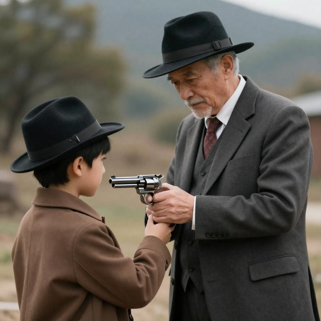 Photograph of a dimly lit, rustic room. Older man in dark suit with white hair sits in a wooden chair, hands raised. Small child in brown clothes sits on the floor, holding a lit candle. Wooden chair and wall on left, wooden cabinet on right. Candlelight casts shadows on the wooden floor and walls.