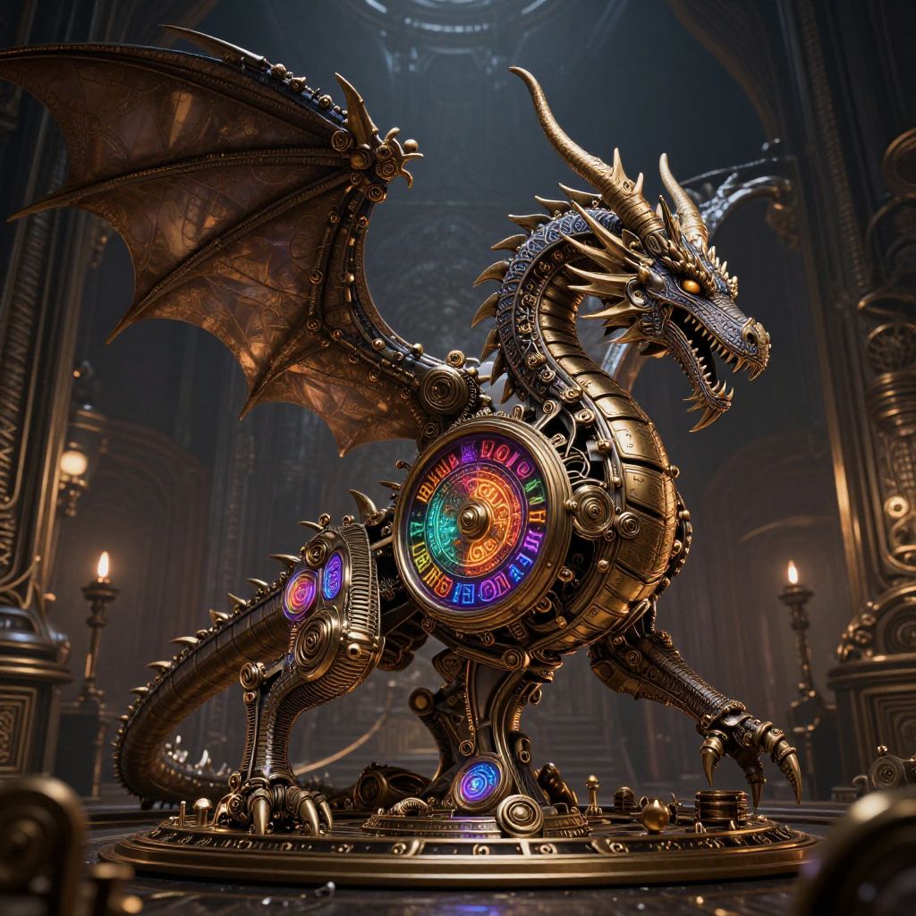 A highly detailed CGI image of a metallic, steampunk-style dragon with intricate gears, cogs, and colorful clockwork mechanisms on its body. The dragon has large, bronze-colored wings, sharp horns, and a fierce expression. Its back features a prominent, multi-colored clock face with vibrant hues of red, blue, green, and yellow. The background is a dimly lit, grand cathedral with ornate architecture and lit candles. The dragon stands on a circular, metallic platform, emphasizing its mechanical and fantastical design. The overall style is a blend of fantasy and industrial elements, creating a striking, futuristic appearance.
