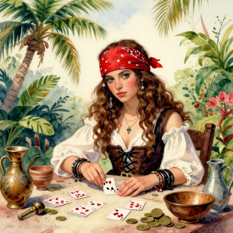 In this captivating watercolor painting, a pirate girl with long, wavy brown hair adorned with a vibrant red bandanna sits at a table in a tropical setting. She is dressed in a white blouse with puffed sleeves and a brown corset, accessorized with multiple bracelets and a necklace, exuding a sense of adventure and style. The table is strewn with playing cards and coins, suggesting a game of poker. Surrounding the table are various objects, including a vase, a pitcher, and a bowl, adding to the scene's authenticity. In the background, a palm tree and other tropical plants create a lush, inviting atmosphere. The painting is signed by John William Waterhouse, a renowned artist known for his historical and mythological scenes. The overall composition is dynamic, with the pirate girl as the focal point, her gaze directed towards the viewer, inviting them into the world of this intriguing scene.