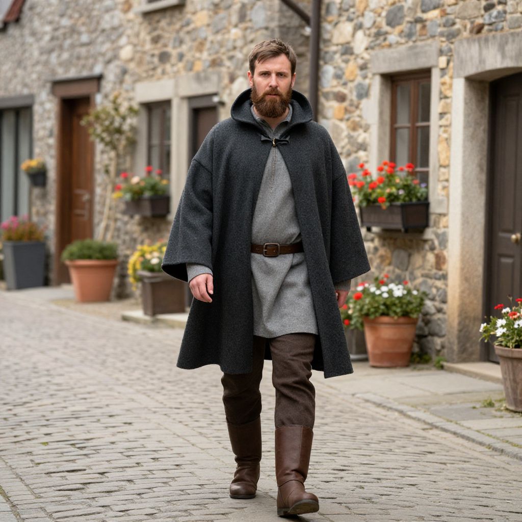 Photograph of a bearded man walking down a cobblestone street in a quaint, stone-built village. He's wearing a dark grey, woolen cloak with a high collar, over a grey tunic and brown pants, belted at the waist. His brown boots match the rustic vibe. The background features stone houses with wooden doors, potted plants, and flower boxes, creating a cozy, medieval atmosphere.
